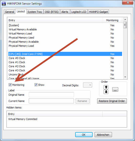Jetzt kommt das Entscheidende: unter "Layout" Tab kannst du alle Sensoren aktivieren/deaktivieren welche geloggt werden sollen ("Zeile für Zeile"). Wenn Sensor geloggt werden soll muss unter "Monitoring" das Häkchen gesetzt sein !