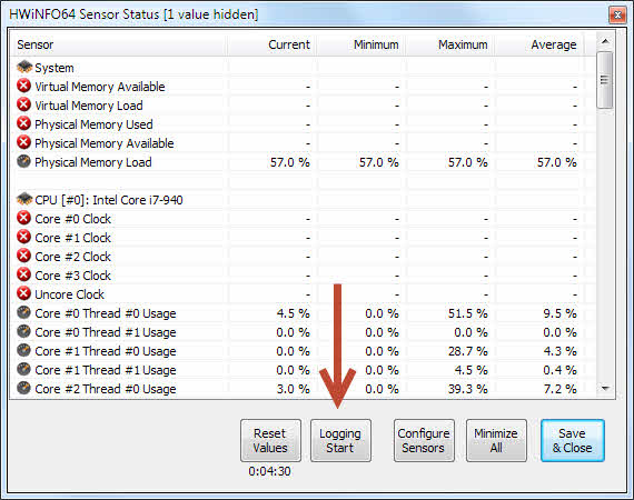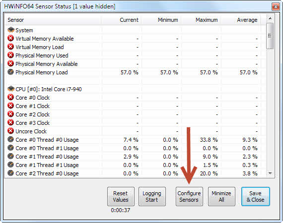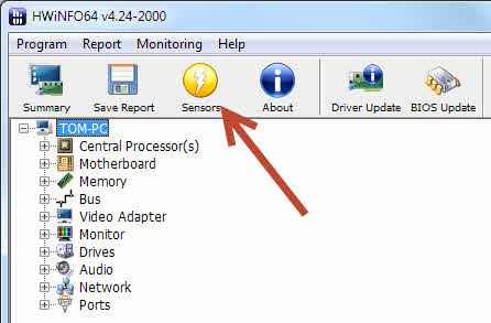 HWINFO starten und auf MainWindow "Sensor" Button anklicken:
