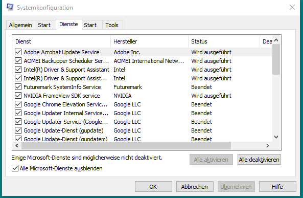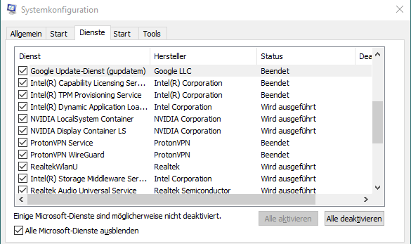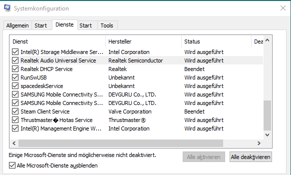 In der Suche msconfig eintippen/ Alle Microsoft-Dienste ausblenden, was bleibt?