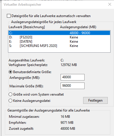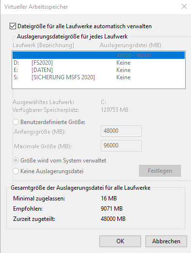 Macht es Sinn, auf der D Portion, auf der der MSFS2020 ist, auch eine Auslagerungsdatei anzulegen?