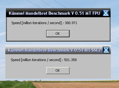 Erstmal, klar, mein Benchmark ist wirklich rein darauf abgezielt, zu sehen, was FPU oder SSE2 im core machen, da er quasi keinen Speicher braucht und komplett im 1st level cache abläuft...ist keine real world Anwendung, solange man nicht viel mit Mathe zu tun hat. Ich sehe aber schon, dass das zum Teil bei so DIVX-encodern und 3D-Renderer ebenso gut zum tragen kommt wie bei den Fractalen.