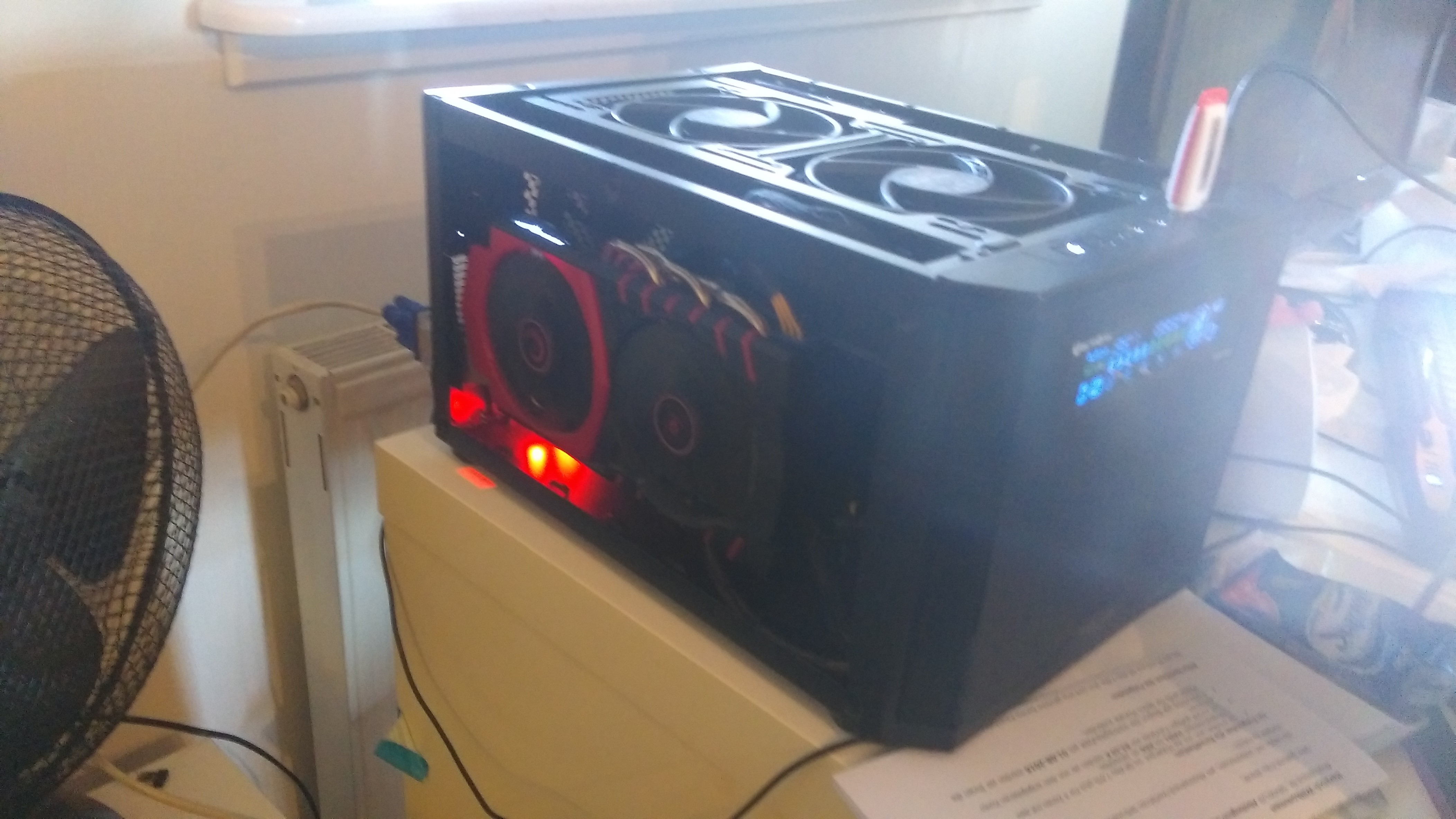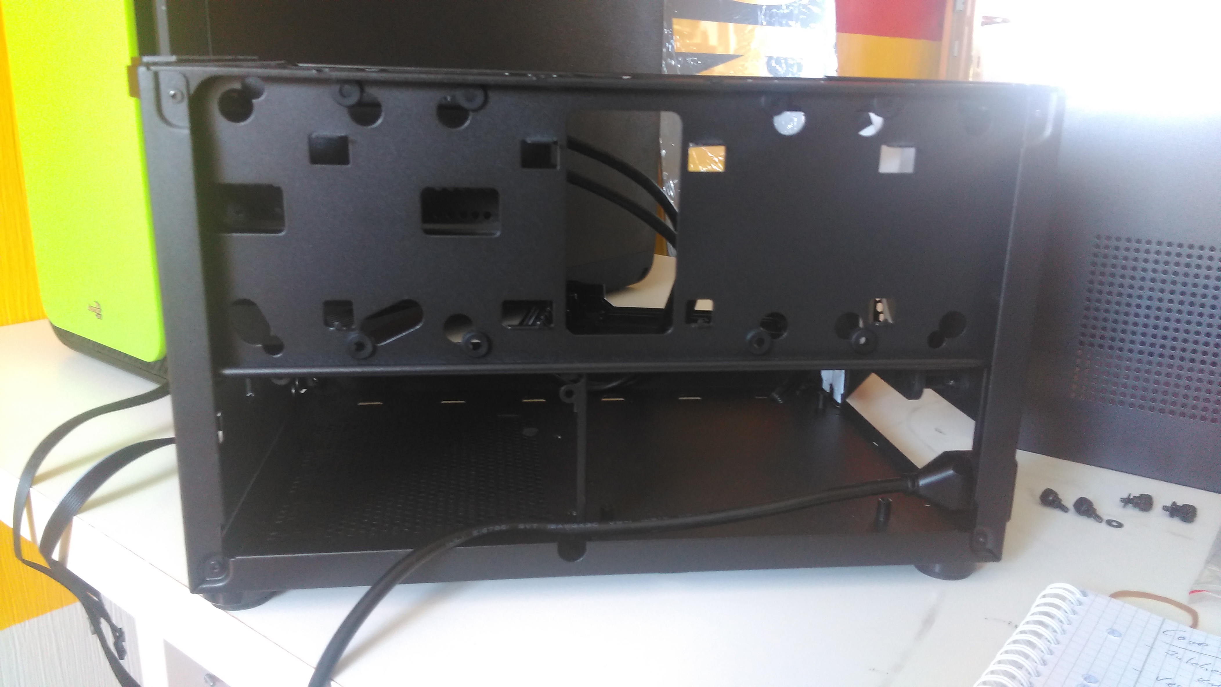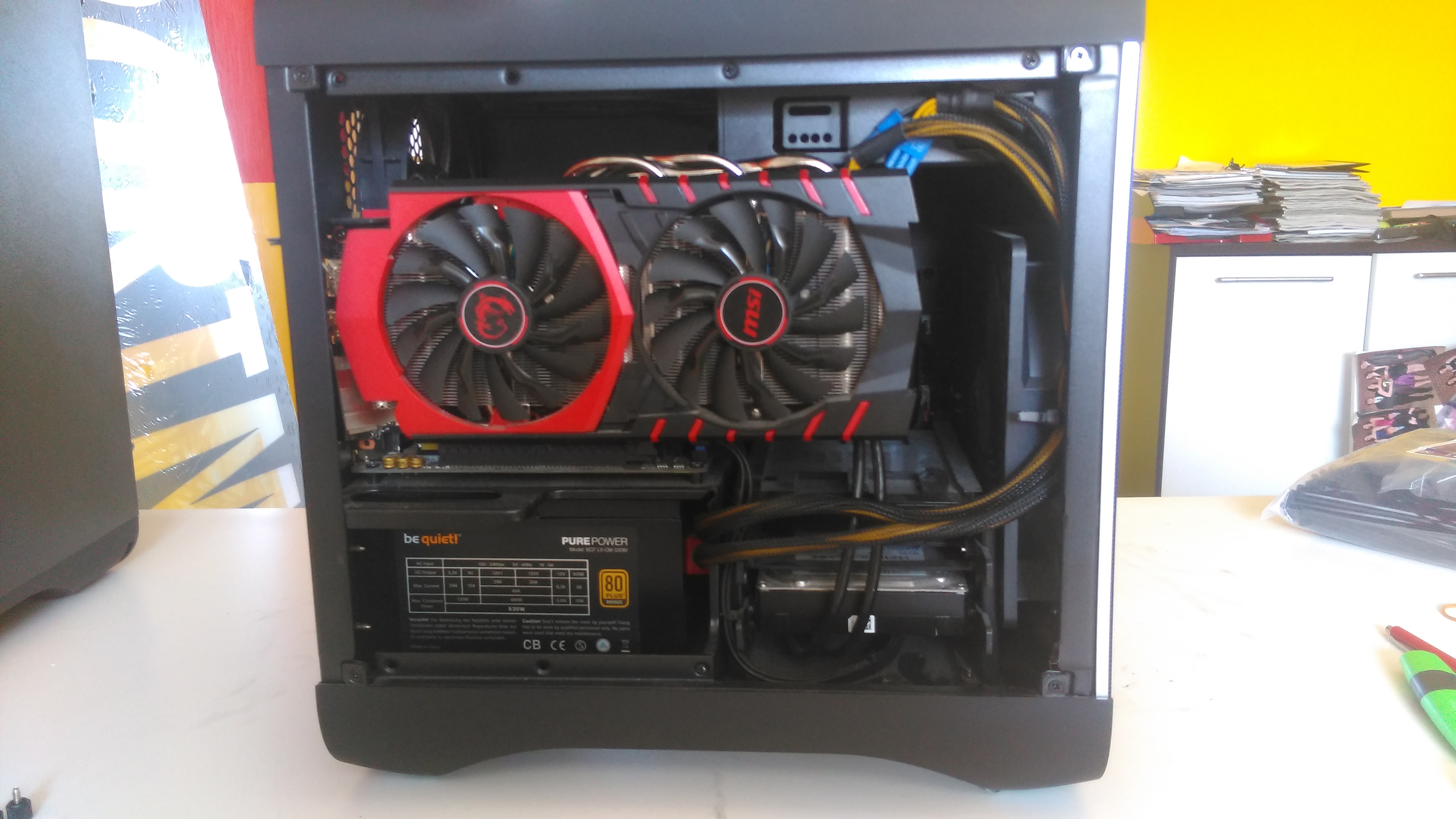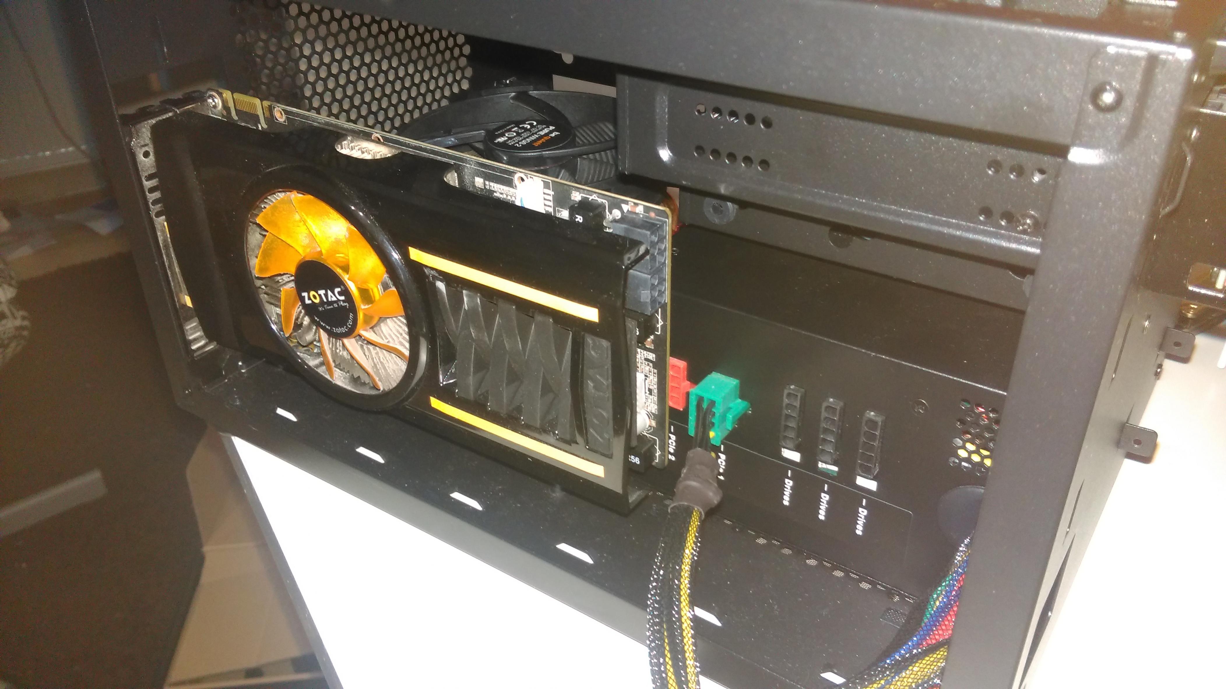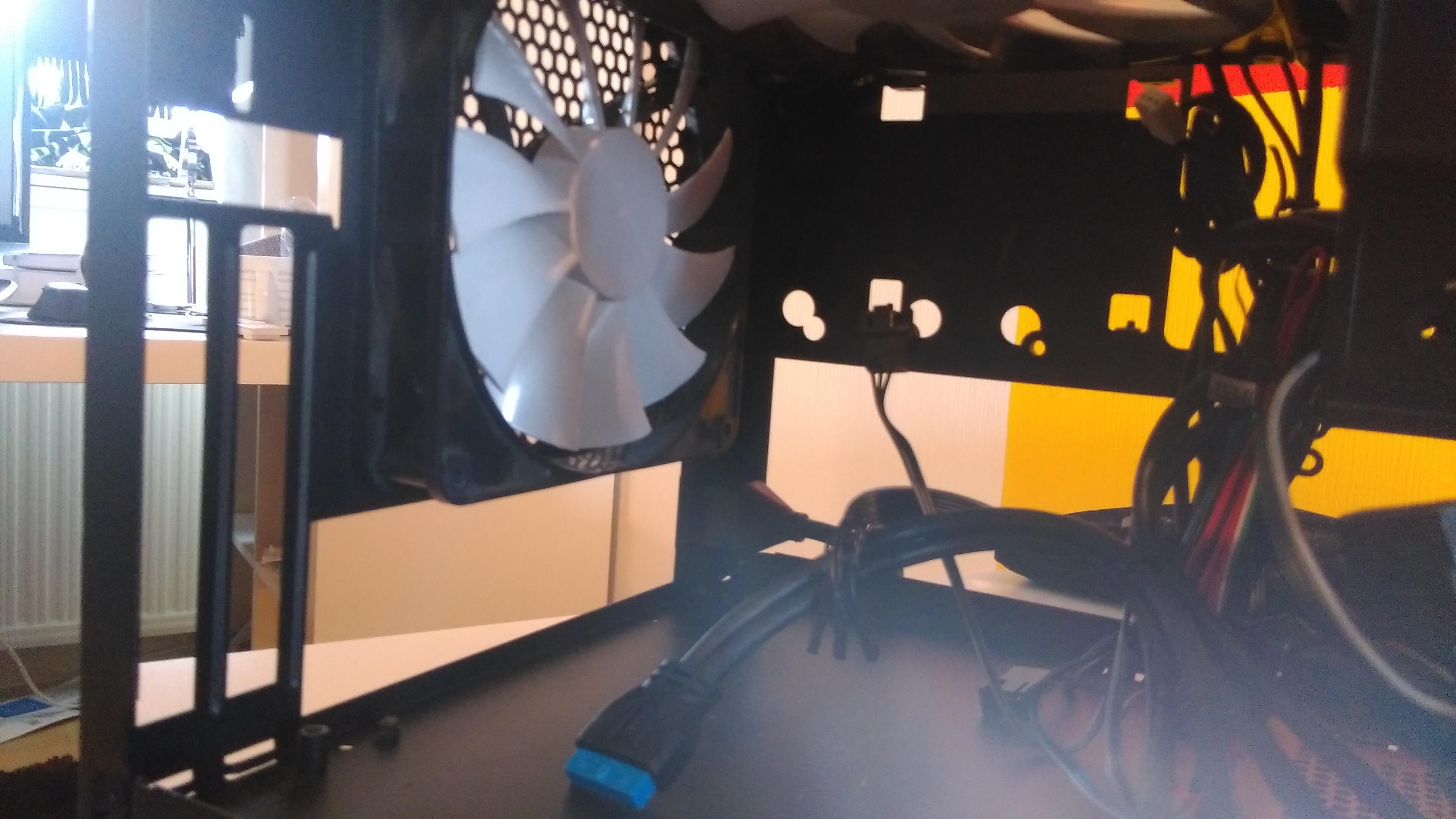 Da wir bei der Grafikkarte schon mal sind, will ich dazu anmerken das meine GTX 960 beim ersten Zusammenbau an der Gehäusewand gerieben hat (Lüfter). Das lag am grünen Stromanschluss der sie ein wenig weggedrückt hat. Das Fixieren mit einem Kabelbinder hat da Abhilfe geschaffen.