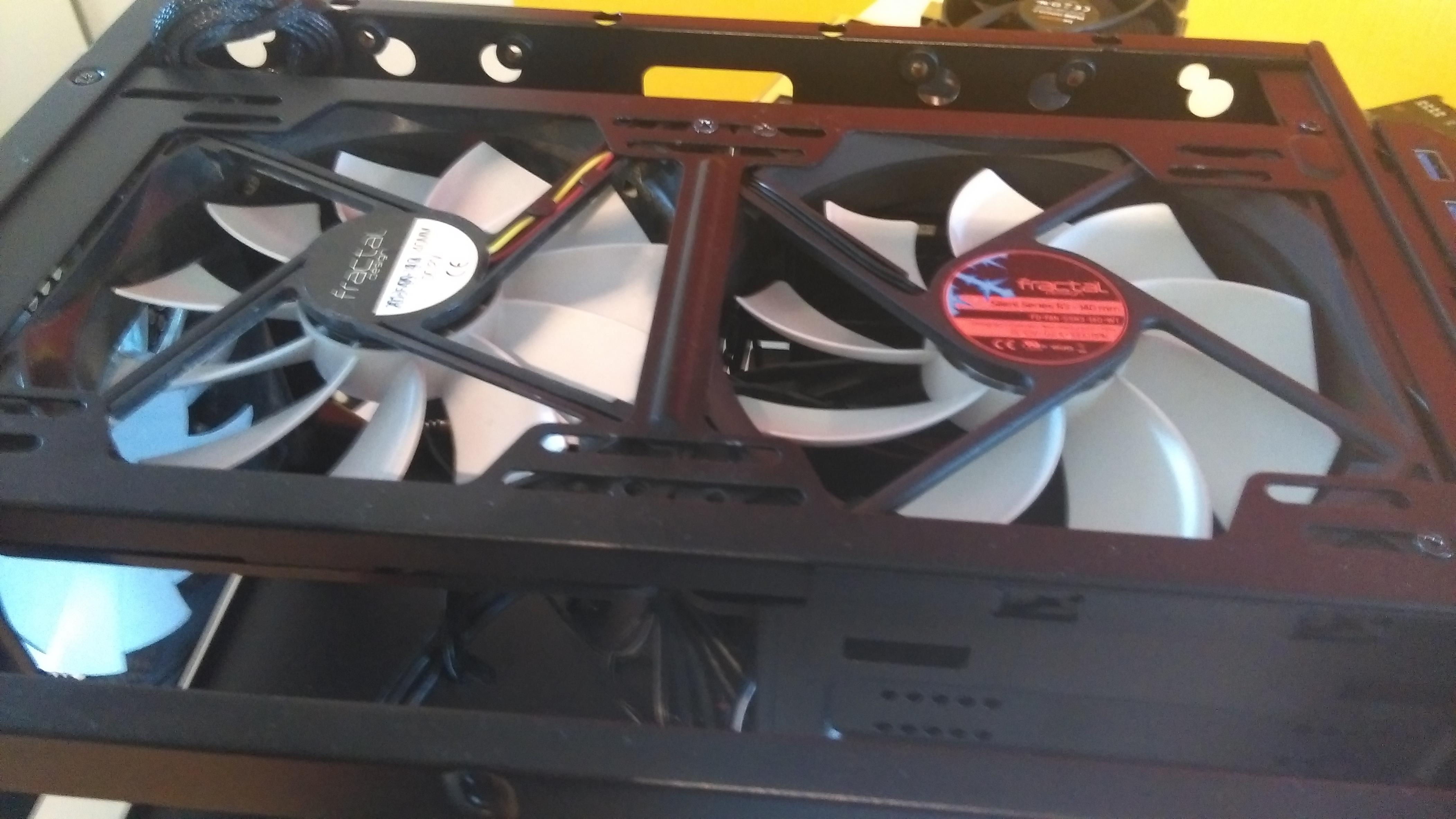 Nun sind die Gehäuselüfter dran. Sobald ein ODD verbaut ist lassen sich nur noch 2 von selbigen verbauen. Für den nächsten Kritikpunkt ist es egal ob ich 2 oder 3 Gehäuselüfter verbaue. Wo schließe ich diese Anzahl auf einem ITX-Board an? Nirgends, ohne 3/4 Pin Y-Peitsche, die es auch für 3 Lüfter gibt, lassen sich die Lüfter nur mit einer Lüftersteuerung ansteuern. Hier könnte sich Fractal überlegen ob man dem Gehäuse eine Dreingabe in Form eines Y-Kabel beigibt oder eine einfache Lüftersteuerung ins Gehäuse implementiert.