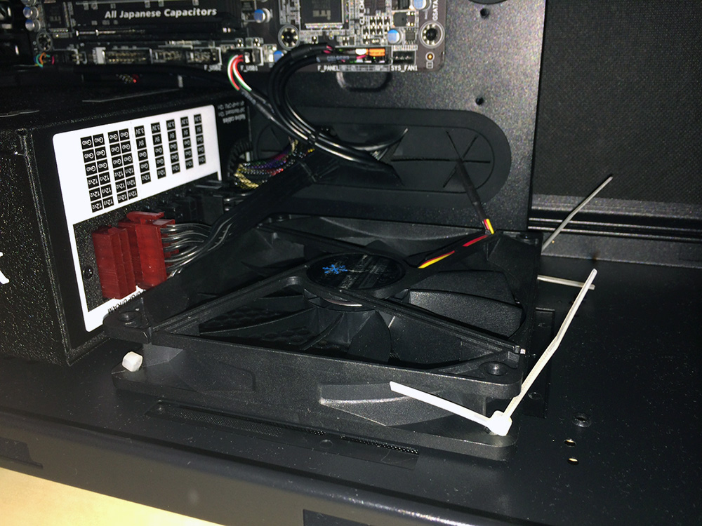 Ich hab jetzt doch den 140mm einbauen können. Dank Kabelbindern konnte ich mit etwas Versatz zu den Befestigungslöchern arbeiten und den Lüfter dennoch gut befestigen. So ein Kabelbinder dient auch als optimale Entkopplung