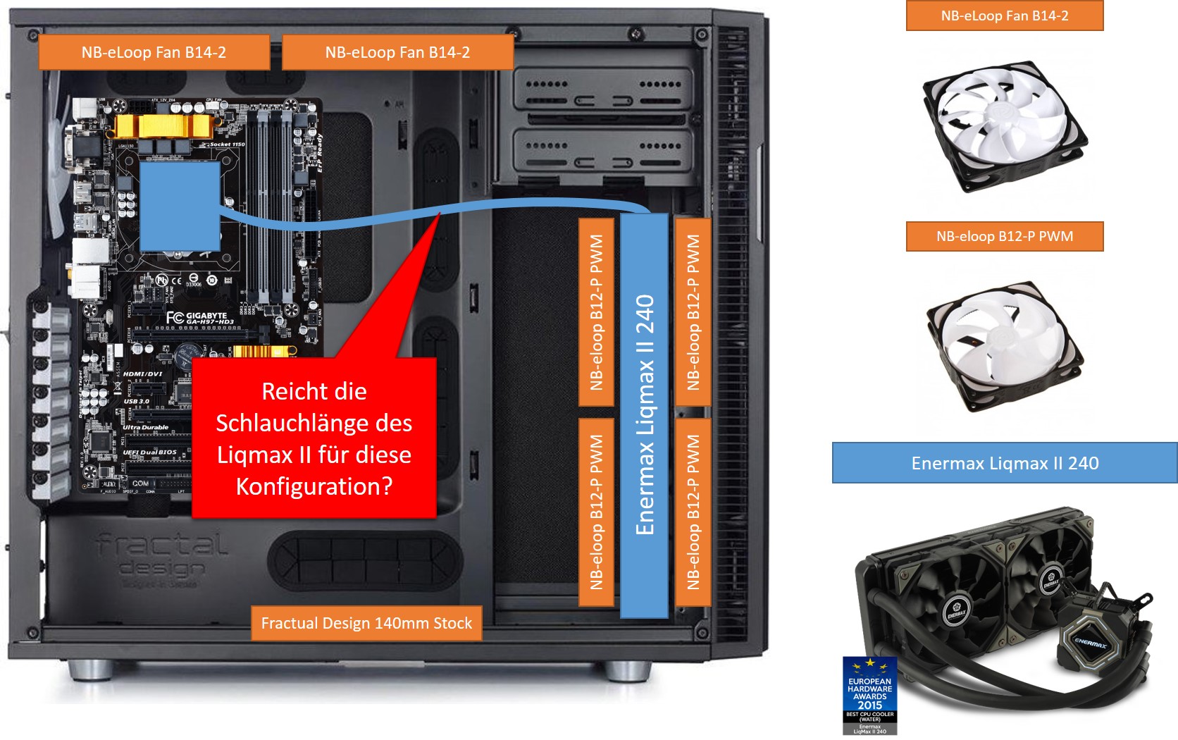 Da ich eine Enermax Liquimax II 240 AiO Wasserkühlung verwende, die ich an die Front verlagern möchte, würde ich gerne wissen ob dies von der Schlauchlänge her überhaupt möglich ist? (Beim Define S funktionierts: Youtube)