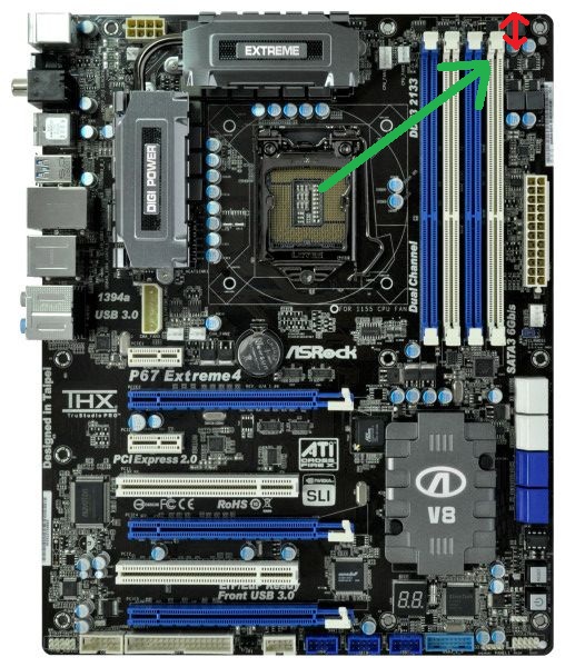 Die Kombi Radiator+Lüfter ist exakt 8,5cm dick und wie auf dem Bild zu sehen (rot markiert) ist beim Asrock Board (wie bei fast allen P67 Boards die ich gesehen habe) die Ram Bänke ziemlich weit oben. Der Spawakühler ist ja ebenfalls ziemlich ausladend