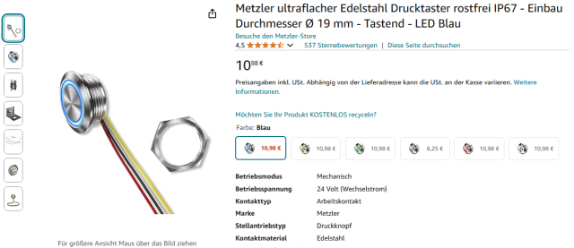 Also habe ich nach einer Alternative gesucht und bin fündig geworden. Gefunden habe ich einen flachen, beleuchteten Klingeltaster mit 19mm Durchmesser und etwa 10mm Tiefe. Diesen gibt es in diversen Farben. Blau gefiel mir am besten. Da hier ja keine Werbung gemacht werden darf, nur soviel: Es gibt Klingeltaster von Metzeler und dazu auch passende Ersatzteile. Bei dem Onlineriesen, der auch Prime anbietet, habe ich den Taster für etwas mehr als 10€ gekauft. Passt wunderbar ohne Nacharbeiten am Gehäuse. Lediglich die Befestigung von hinten muss mit Heißkleber bewerkstelligt werden und die Kabel mit passenden Steckern verlängert werden.