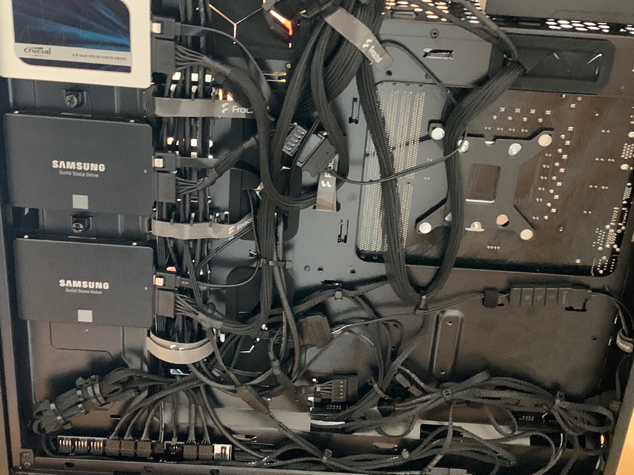 Bringt vielleicht ein Austausch der SATA- und Stromkabel der SSDs gegen höherwertige und schlankere etwas? Ich musste zwei dicke NT-Kabel verwenden, weil ein Kabel zur Versorgung aller drei SSDs nicht lang genug war.