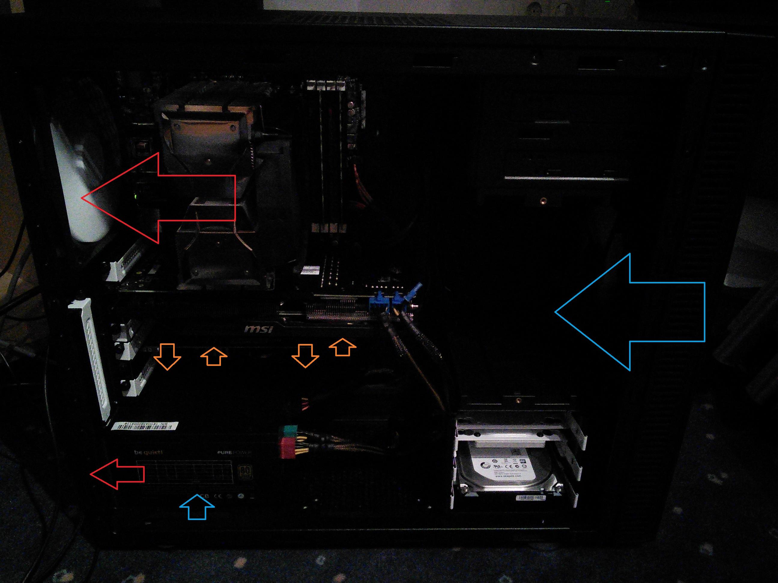 Netzteil habe ich so eingebaut, dass der Lüfter des Netzteils (Dark Power Pro 10 550W) die Luft aus dem Gehäuse zieht. Das muss natürlich nicht unbedingt eine gute Lösung sein, für mich funktioniert sie aber. Im Netzteil sitzt ein Temperaturfühler, der die Gehäuselüfterdrehzahl anhand der Temperatur im Gehäuse regelt, und dazu muss laut Be Quiet Support das Netzteil halt so rum eingebaut werden (vor allem lassen sich die Kabel so besser verlegen!).