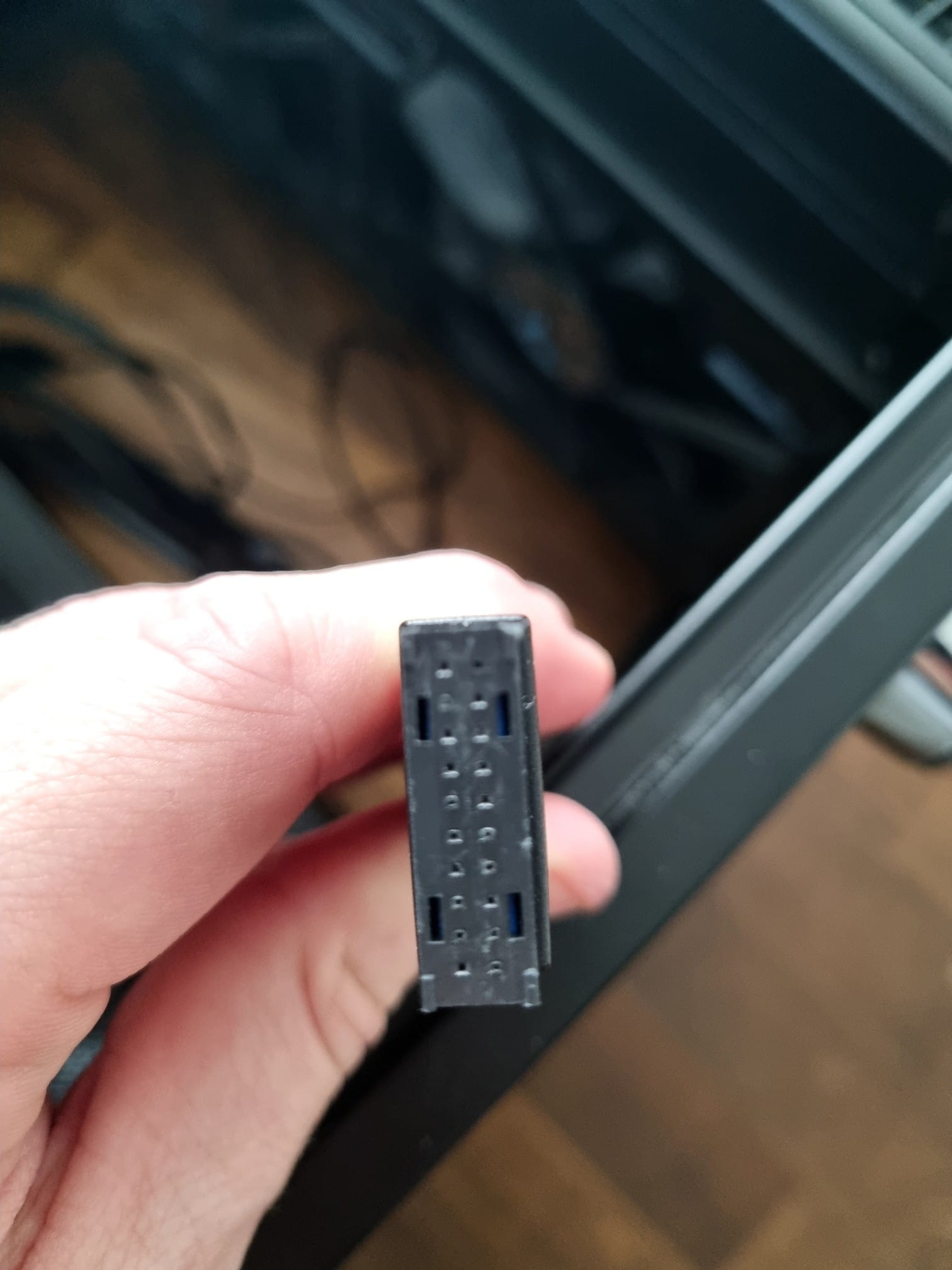 Laut ASUS Manual müsste der Teil USB3_34 der interne USB 3.0 Anschluss sein. Auf dem USB Kabel des Gehäuses ist eine graue Kappe. Ist das eine Art Schutz der ab muss? Wenn die Kappe drauf ist habe ich jedenfalls nicht auf die Pins auf dem Mainboard. Kommt mir nicht so vor als würde man das leicht abbekommen, möchte natürlich nichts kaputt machen.