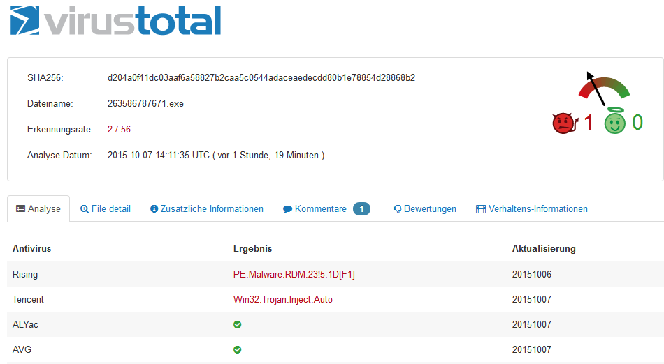 Was die Malware-Erkennung bei Virustotal.com angeht, hier ein schönes Beispiel von HEUTE (!!):