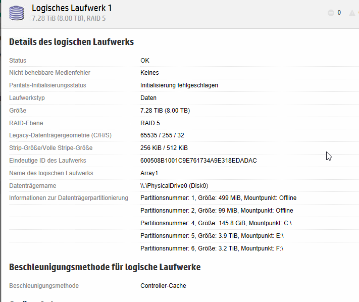 Nun nach drei Wochen zeigt der RaidController ein Fehler im Paritäts-Initialisierugnsstatus des logischen Laufwerks an (siehe Bild).