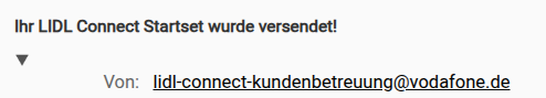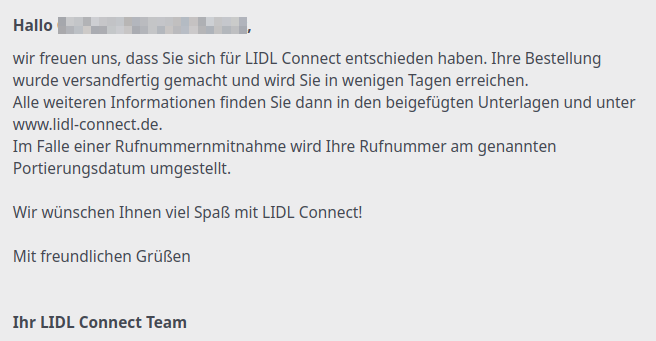 Der Wortlaut der eMail von Lidl-Connect wegen Zusendung eines neuen Starterpakets: