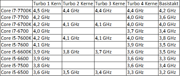 ich überlege gerade welche CPU ich in meinen neuen Rechner einbauen soll. Da mir von einem K-Prozessor abgeraten wurde (ich will nicht übertakten) versuche ich über ein Aufstellung der Taktraten eine Entscheidung zutreffen, gerade auch ob es schon eine Kaby Lake CPU oder noch eine Skylake CPU werden soll. Leider kriege ich die Tabelle nicht komplett gefüllt, da mir teilweise Taktangabe fehlen. Hier aber auch die Frage, brauche ich die überhaupt oder reicht als Entscheidungskriterium der Turbotakt bei einem und vier aktiven Kerne.
