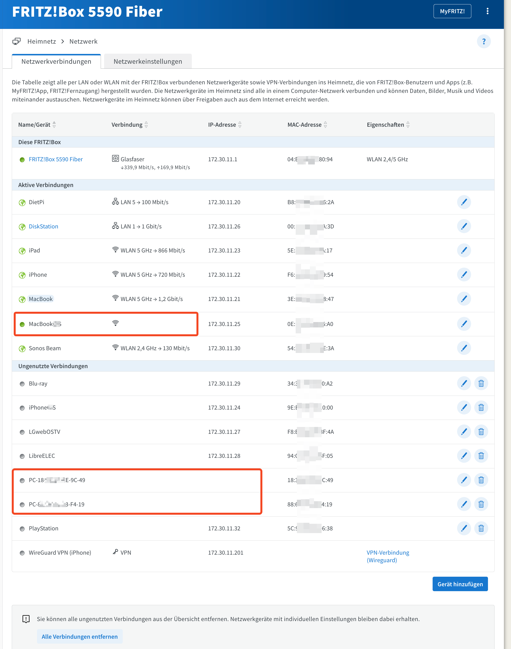 Ich habe zwei Fragen zu angehängtem Screenshot der Netzwerkverbindungen in FritzOS. Der Screenshot wurde um 21:00 Abends gemacht, die obere rote Markierung ist mein Arbeits-MacBook welches ich um die späte Nachmittagszeit heruntergefahren habe. Es ist also aus gewesen am Abend und sollte keine aktive Netzverbindung mehr zum WLAN haben.