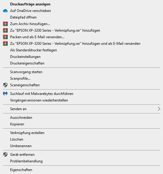 Hier kann ich per Rechtsklick natürlich auf die wichtigsten Funktionen zugreifen bzw. auf einige (wenn ich auf "Druckereinstellungen" bzw. "Druckereigenschaften" gehe):