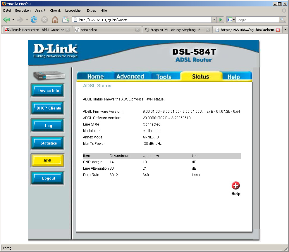 Nun kann ich mit meiner Fritz-Box die Leitungsdaten auslesen, siehe Screenshot: