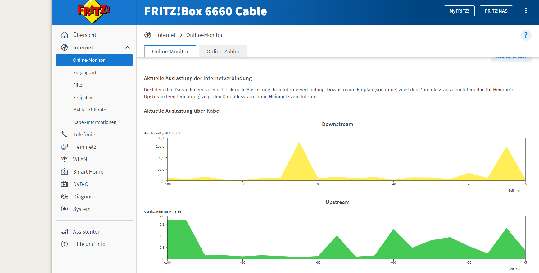 Was kann ich jetzt wo sehen und kontrollieren? Grafik des Upstream zeigt 0,4 bis 1,2 Mbit/s an als aktuelle Auslastung (alles grüne und daher laut Anzeige: normale Anwendungen)