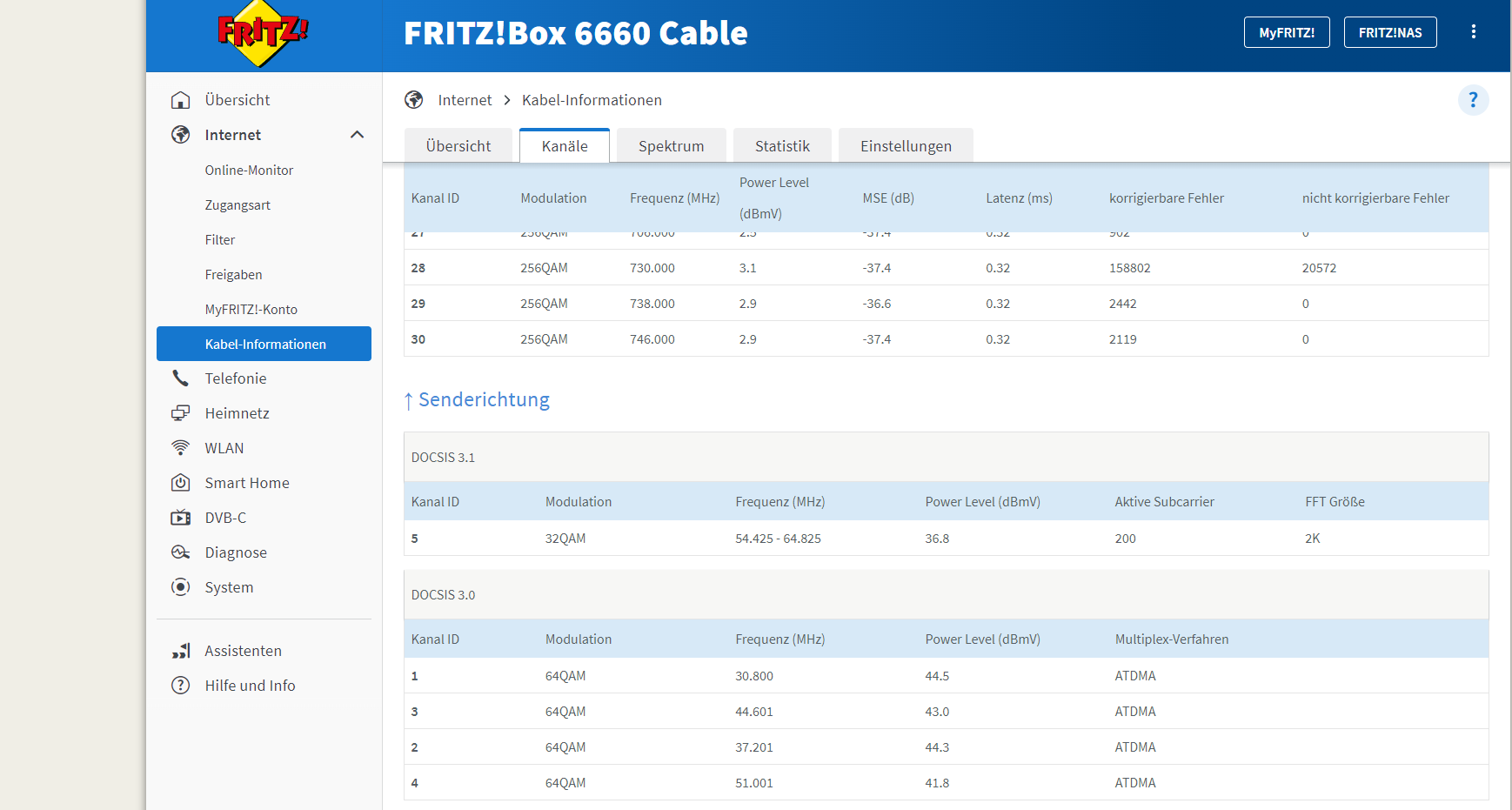 Die Modulation ist mit 64QAM top und das Powerlevel für die einzelnen Kanäle ist ebenfalls in der Toleranz.