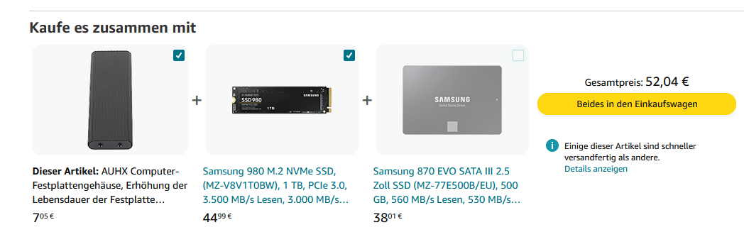 Okay danke , also Beispiel ich Kauf sie ssd von Samsung 970 für 47 Euro , dann kann ich sie auch in ein externes Gehäuse richtig ?di26 schrieb:Bedenke, dass eine Festplatte extrem unpraktisch ist, erst recht, wenn du dafür zusätzlich noch ein Netzteil brauchst. Du willst sie ja an einen Laptop anschließen, also gehe ich von mobiler Nutzung aus. Mechanische Platten sind viel anfälliger als SSDs und auch schwerer. Die Ladezeiten bei Spielen sind auch schlechter. Ich würde an deiner Stelle entweder warten bis ich mir die große SSD leisten kann oder mit der kleinen leben.