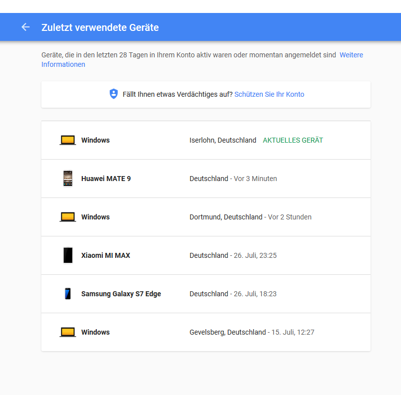 ich habe soeben mal in meinem Google Konto den Geräteverlauf geprüft und siehe da, da stimmt was nicht.