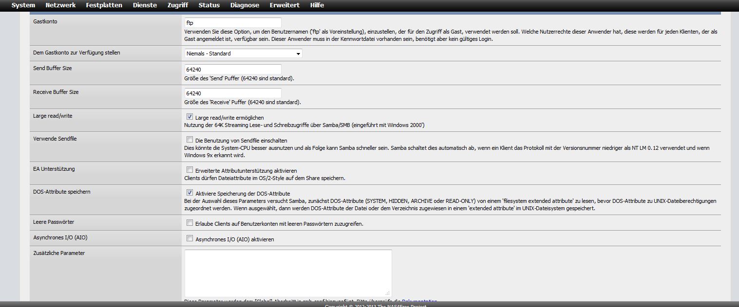 öhm...das müsste man unter services -> CIFS/SMB finden, da stehen dann auch solche sachen wie die authentifizierungsmethode, asynchronous input/output (AIO), E/A Attribute usw.