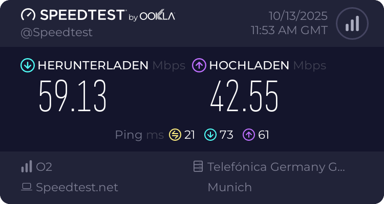 Der Tests wurden mit einer o2 Business Unlimited MAX Data-Karte im LTE-Netz (ländlicher Raum) durchgeführt.