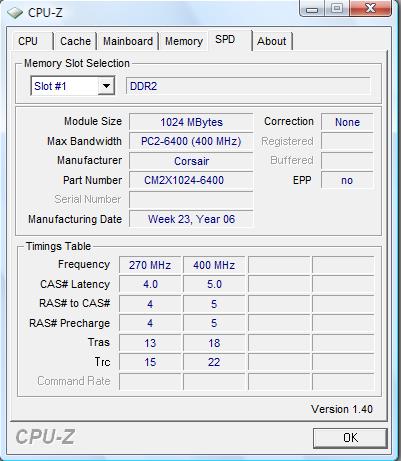 Hallo Leute, möchte euch mal was zu den Timings vom Ram fragen. Als Anhang hab ich ein Bild von cpu-z hochgeladen. Warum zeigt mir das Programm unter "Timings Table" 270 Mhz und 400 Mhz mit anderen Timings an???? Hat jetzt mein Ram 574 Mhz oder 800 Mhz (effektiv). Und wie ist es mit den Timings, welche habe ich nun?? Die Timings sind normal 5-5-5-12. Kann ich die Timings evtl ändern. habe auch noch 4x 1 GB davon drinnen. Werden auch dann die Riegel drastisch heißer oder eher nicht. Und die nächste Frage wäre noch was zum C2D. Und zwar......ist ein übertakteter E6600 genauso heiß wie wie ein normaler X6800, also wenn die Taktraten beider identisch sind. Wenn nicht, wie schafft es der X6800 nur mit nem höheren Multi, dass der Takt höher ist und dass die Temperatur niedriger ist wie ein Übertakteter E6600 @ 2999 Mhz.
