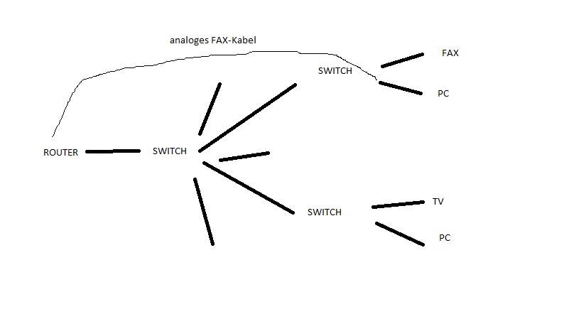 1) Gibt es eine Möglichkeit über eines der Netzwerk-Kabel sowohl das Netzwerk (an PC) ALSAUCH das Fax-Signal analog zu senden (wir haben nur ein Kabel liegen und bracuhen aber am Ende sowohl einen PC-Anschluss alsauch den anaolgen Fax-Anschluss für das Multifunktions.Fax-Gerät)