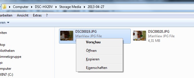 Von dort kann ich die Dateien kopieren. Klicke ich eine Bild-Datei doppelt an wird diese aber auch nicht mit dem für diesen Dateityp verlinkten Programm geöffnet, sondern mit der Windows-Vorschau.