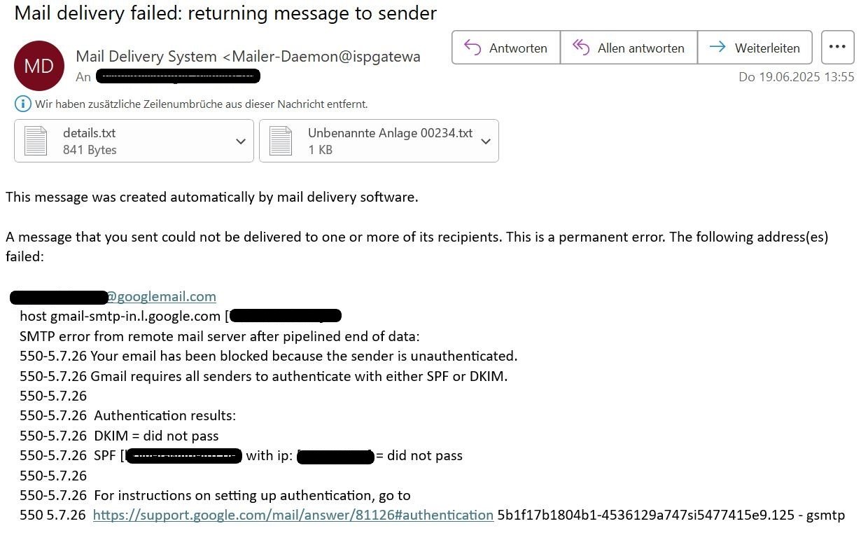 Leider bekomme ich weiterhin die Fehlermeldung wenn ich eine EMail versende. DKIM und DMARC wird wenn ich es richtig verstanden habe von df.eu nicht unterstützt, aber eigentlich sollte doch der SPF Eintrag reichen, oder?