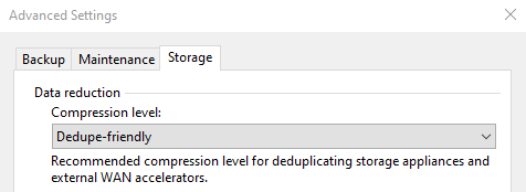 Soweit ich das verstehe kann Veeam Agent Backups von lokalen Geräten komprimieren. Nun habe ich mir mal den Veeam Agent installiert und etwas mit den Einstellungen herumgespielt. Dabei bin ich auf folgende Einstellung zur Kompression der Backups gestoßen: