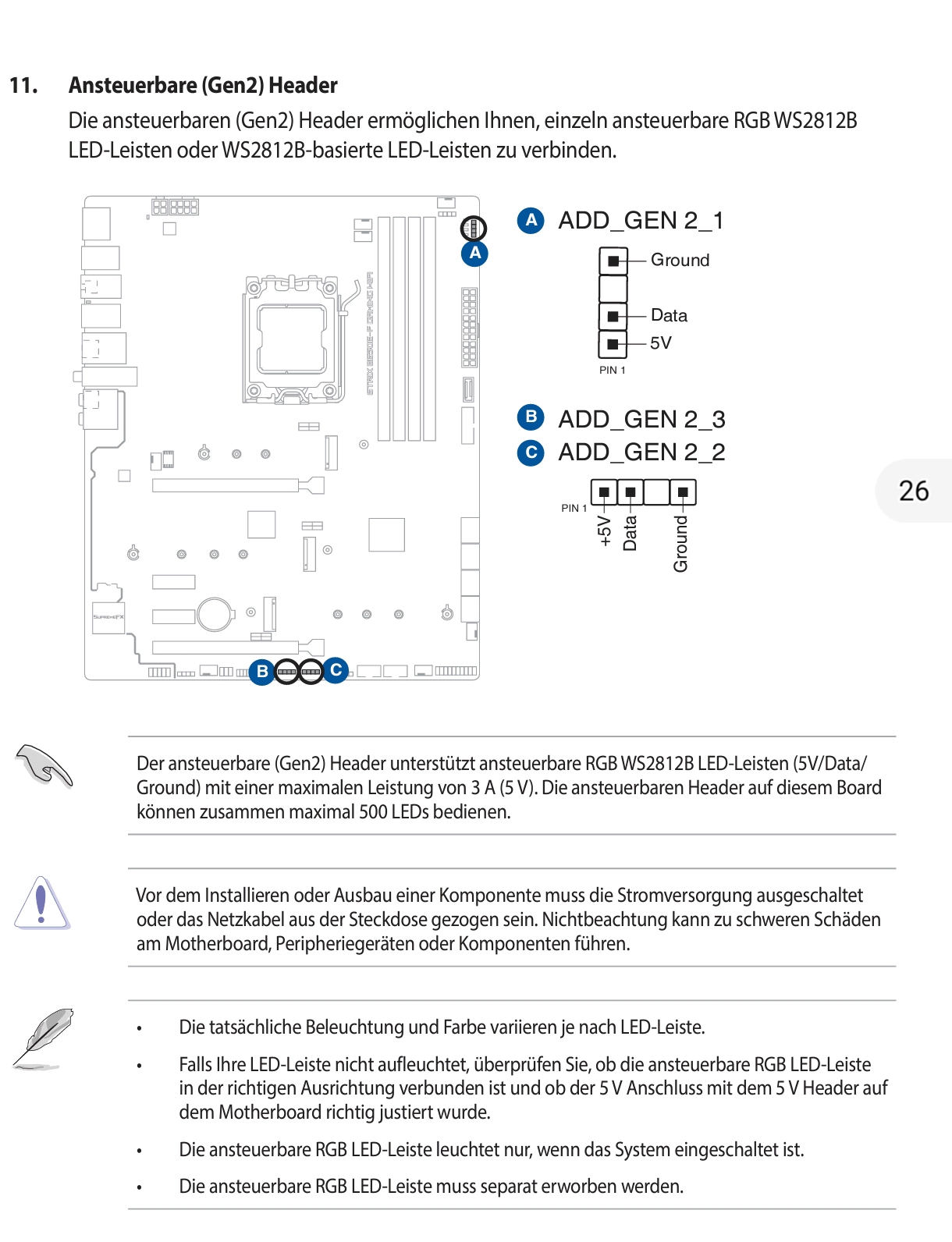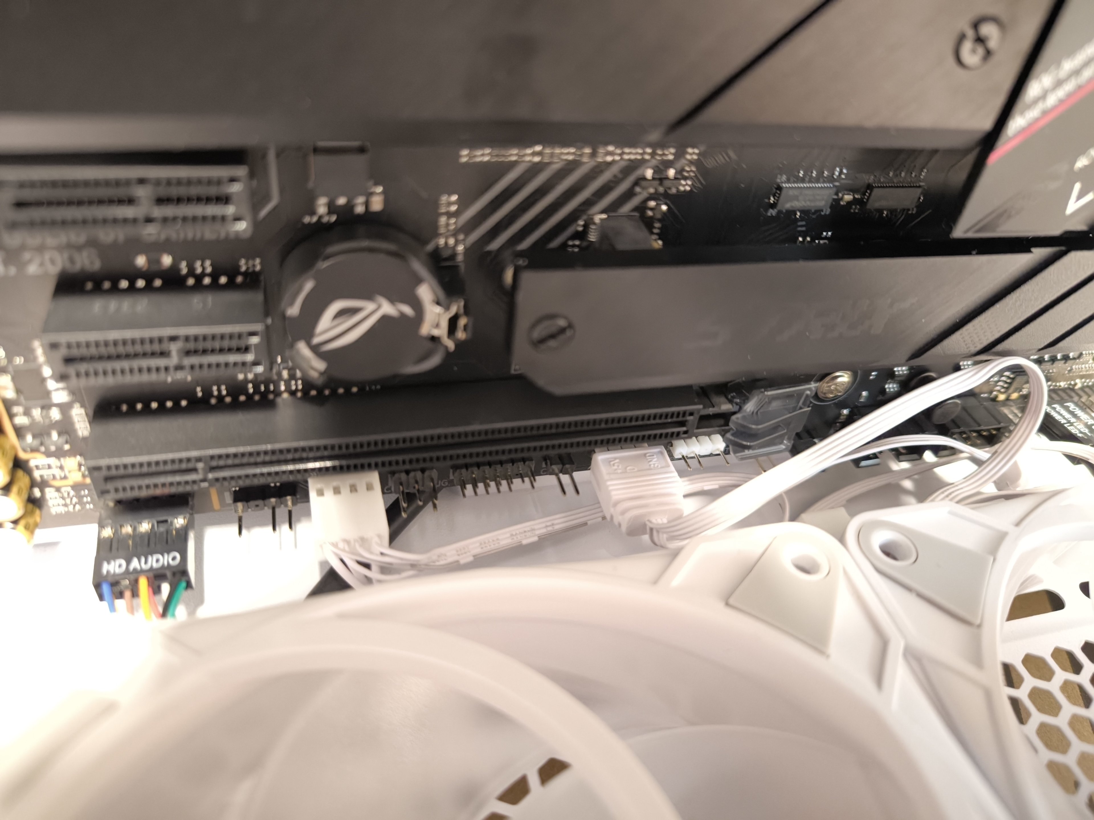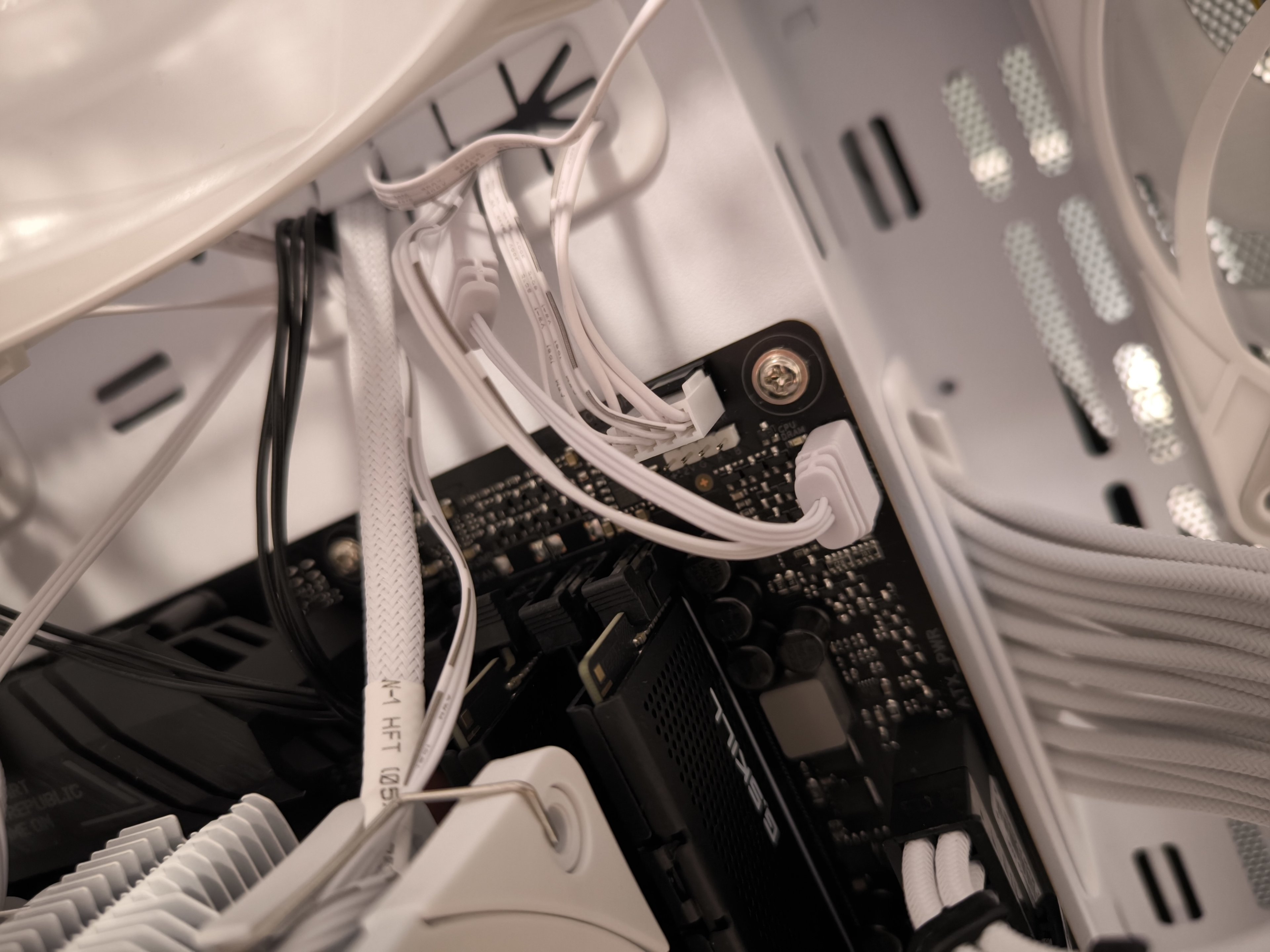 Die einblasenden Lüfter unten und an der Seite sind alle per Daisy Chain verbunden und bekommen Strom sowie RGB vom Mainboard unten.