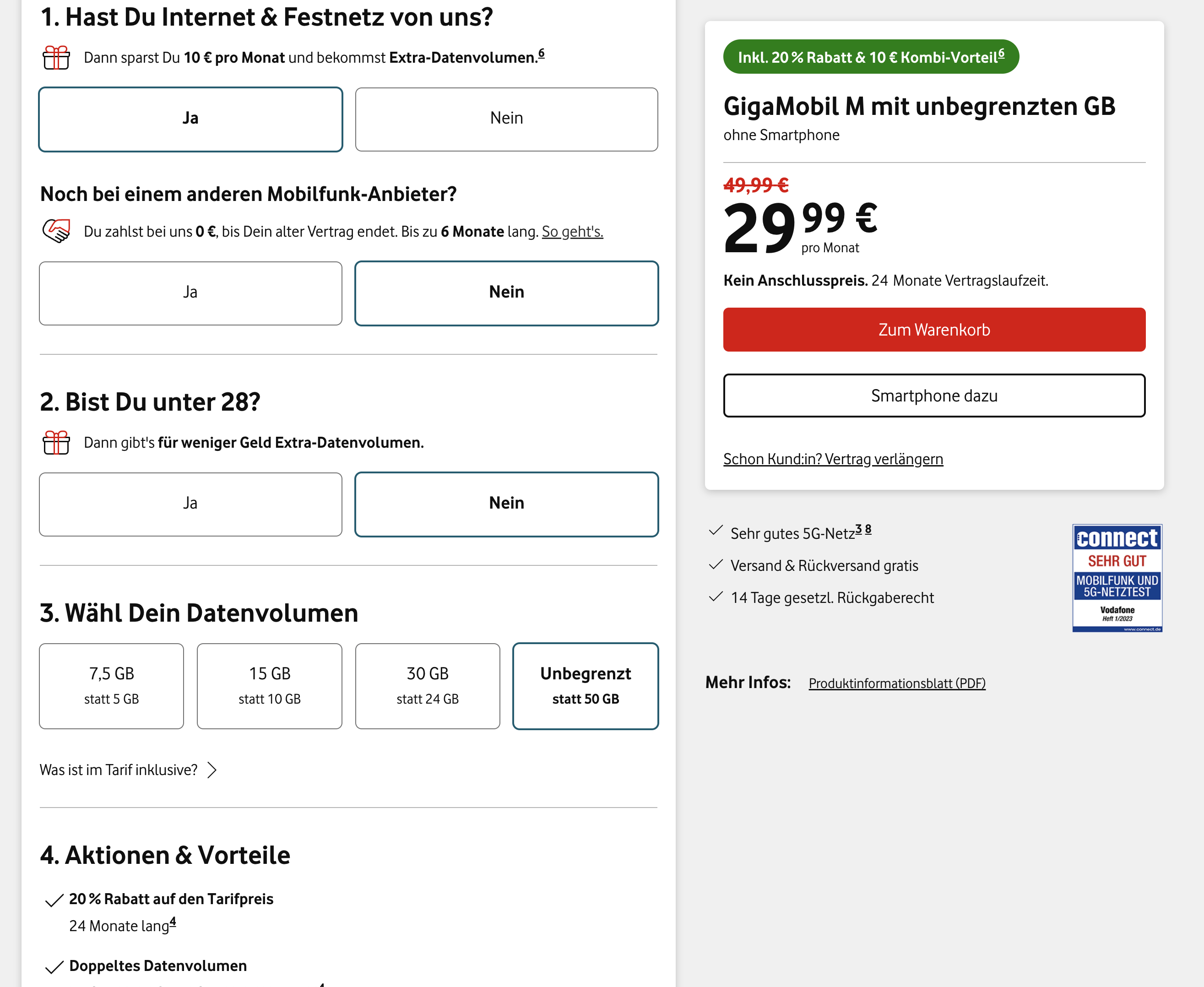 Hab die Eingabemaske entsprechend ausgefüllt und mich rechnet er 29,99 EUR aus für den Tarif für 24 Monate mit unbegrenztem Internet.