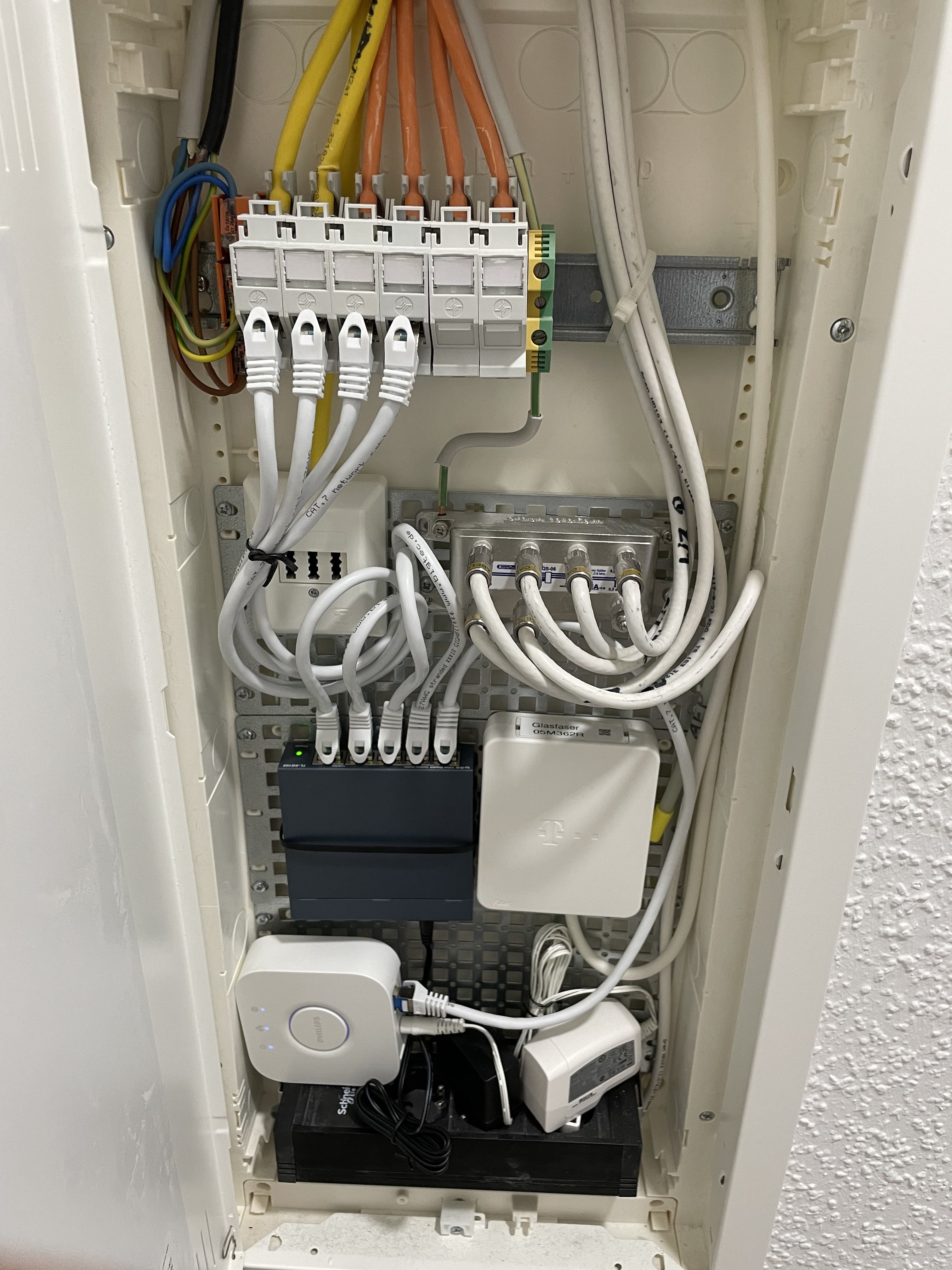 Der Router befindet sich aktuell im Büro. Der Hauptrechner ist direkt am Router angeschlossen. Vom Router geht ein LAN Kabel in die Wanddose. Im Verteilerschrank auf dem Flur habe ich einen kleinen Switch und den Hue Hub montiert und von dort die wichtigsten Räume (WZ den TV etc) am Switch angebunden.