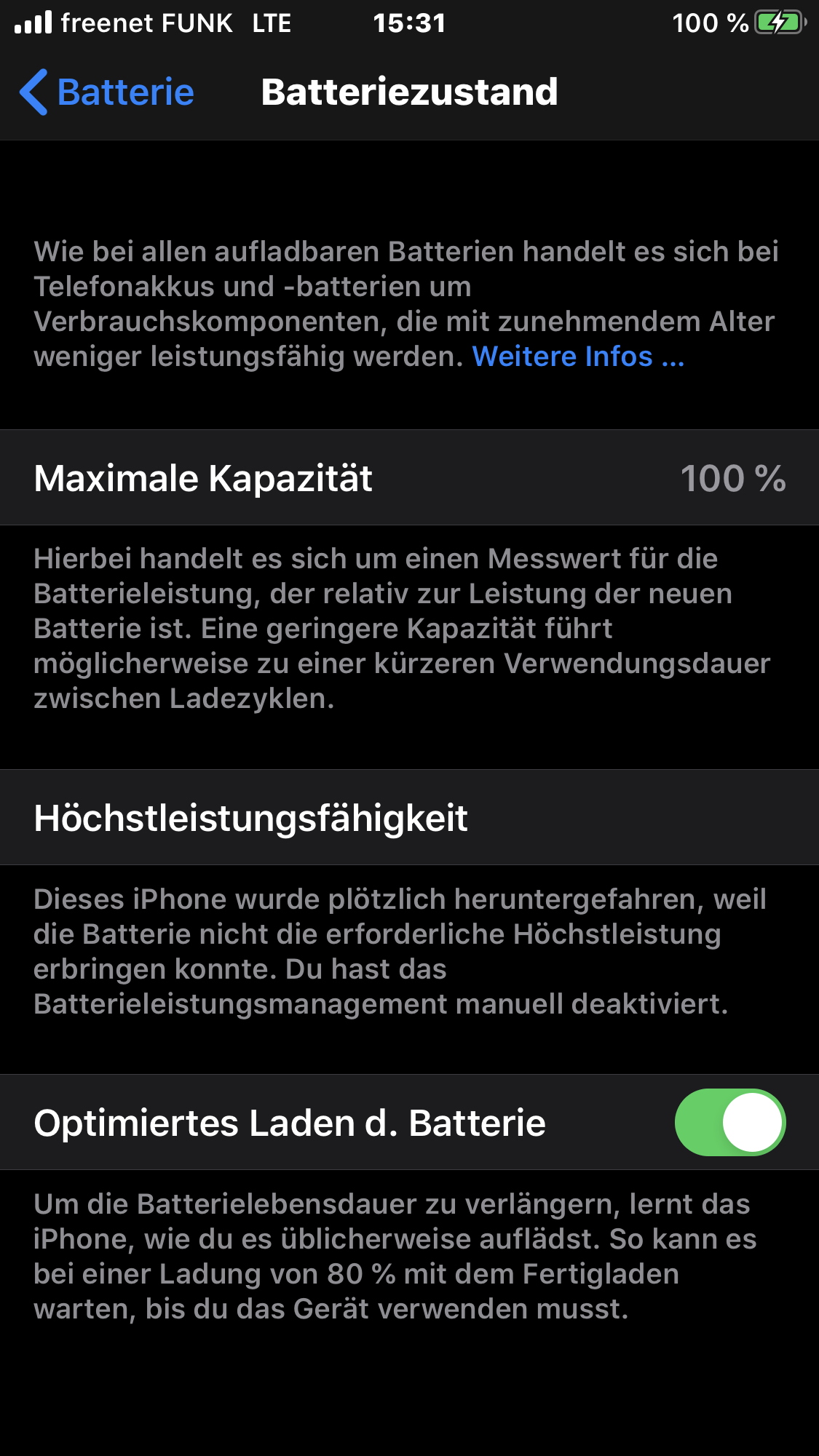 Ich hab heute mein IPhone 8 plus vom Akkutausch zurückbekommen. Der Akku wurde getausch und das Backcover warum auch immer. Jedenfals müsste doch jetzt unter Batterie stehn das das IPhone Hochleistungsfähig ist oder, stattdessen steht dort siehe Bild.