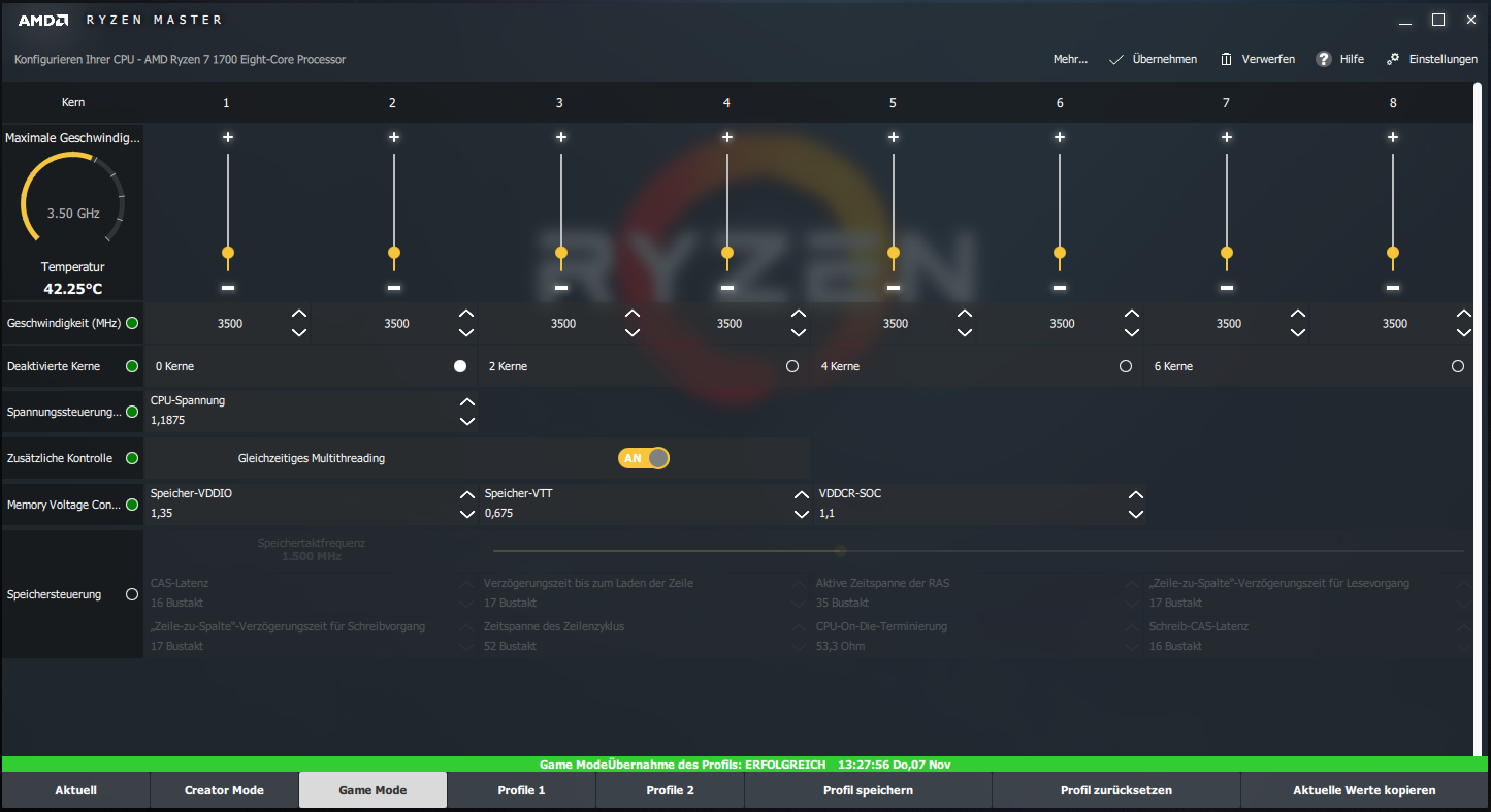 ich bin außerdem dabei momentan etwas meine cpu zu übertakten, warum? ich besitze einen 144hz monitor und in einigen multiplayer titeln wie battlefield v sind mir die fps etwas zu niedrig und dabei ist es fast egal welche grafikeinstellungen ich nutze, genau deswegen möchte ich den cpu takt leicht anheben (evt liegt an gar nich an der cpu?!), warum nur leicht? weil ich mit dem boxed kühler unterwegs bin. das ganze möchte ich möglichst einfach und probehalber mit dem ryzen master tool machen. versteht mich nicht falsch, ich möchte lediglich den takt etwas anheben ohne dabei großartig die spannung erhöhen zu müssen, da die temperaturen bei volllast im stock schon mal auf 70 klettern, deswegen habe ich gar nicht viel spielraum. neue hardware kommt finanziell nicht in frage, deswegen möchte ich ja versuchen wenigstens leicht zu übertakten. ich bin aber schon einmal KURZ soweit gegangen, den auf 3,7ghz all core zu prügeln bei 1,35v spannung, da hatte ich dann in battlefield v plötzlich gefühlt 30 fps mehr, möglicherweise waren es tatsächlich nur 10 bis 15, allerdings blieb die temperatur bei prime95 10min lang bei 70 grad und kletterte in der nächsten minute hoch auf 78 grad - da habe ich prime dann beendet und die 3,7ghz sind für mich geschichte (wovon ich natürlich auch ausgegangen bin mit dem boxed kühler, der dafür nicht ausreicht). was ist also meine vorhaben? ich würde die cpu gerne stabil bis auf 3,5ghz übertakten bei einer möglichst geringen spannung, weil das ja auch immer bedeutet, dass die cpu länger lebt und nicht so warm wird, richtig? mir fehlen jetzt zum einen die werte, die bei 3,5ghz problemlos funktionieren sollten bzw. erfahrungen von anderen, warum? weil viele in den foren gleich von 3,7 oder 4ghz reden, da möchte ich ja gar nicht hin.