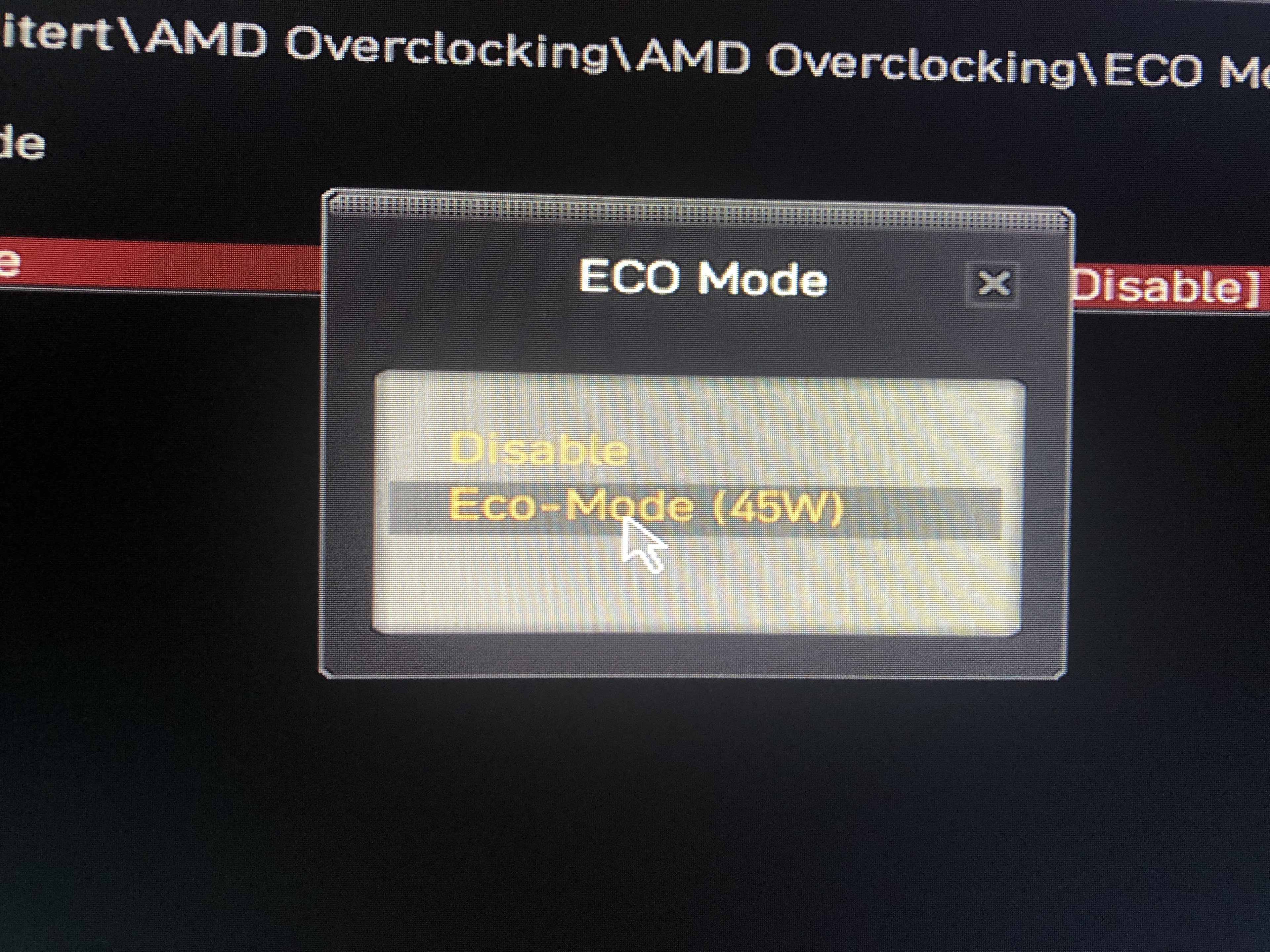 Der Eco Mode kann in der MSI OC Rubrik aktiviert werden oder in diesem AMD Bereich. Da gibt es extra einen Button drin, wo eben ECO Mode steht. Glaube 45 Watt von Hause aus. Kann man so nutzen oder eben auch ändern. Bei der Einstellung 45 Watt zieht meiner eben 60 Watt, sollte beim R7 3700x auch so sein, obwohl er mehr Kerne hat.