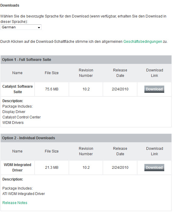 Der enthält den Display, OpenCL und ATI Integrated Driver sowie das Catalyst Control Center in englischer Sprache. Wenn ich es nun in Deutsch haben möchte und bei "individual Downloads" schaue, gibt es den zwar, aber nur in Form des Catalyst Control Center, die anderen bestandteile sind nicht dabei.