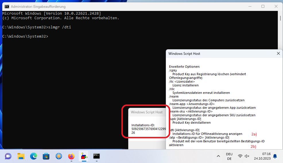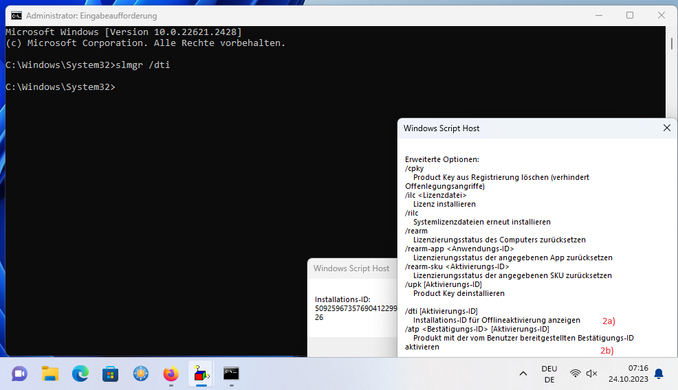2a) mit slmgr /dti kann man ja die Installations-ID für für Offlineaktivierung anzeigen.