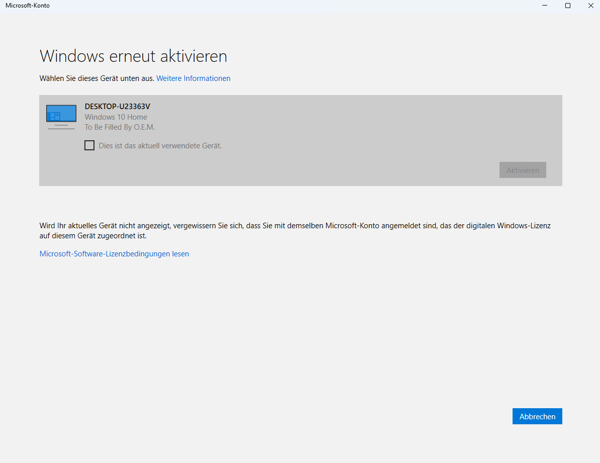 So hab es getestet, mit der von Terrier beschriebenen Methode, was leider nicht funktioniert hat. Bei der Problembehandlung und einem Klick auf "kürzlich geänderte Hardware" wird der alte Rechner mit der Windows 10 Home Lizenz angezeigt. Wenn ich diesen auswähle wird es mit der Meldung, dass Windows nicht aktiviert werden konnte und ich es später nochmal versuchen soll quittiert. Habe Screenshots im Anhang beigefügt.