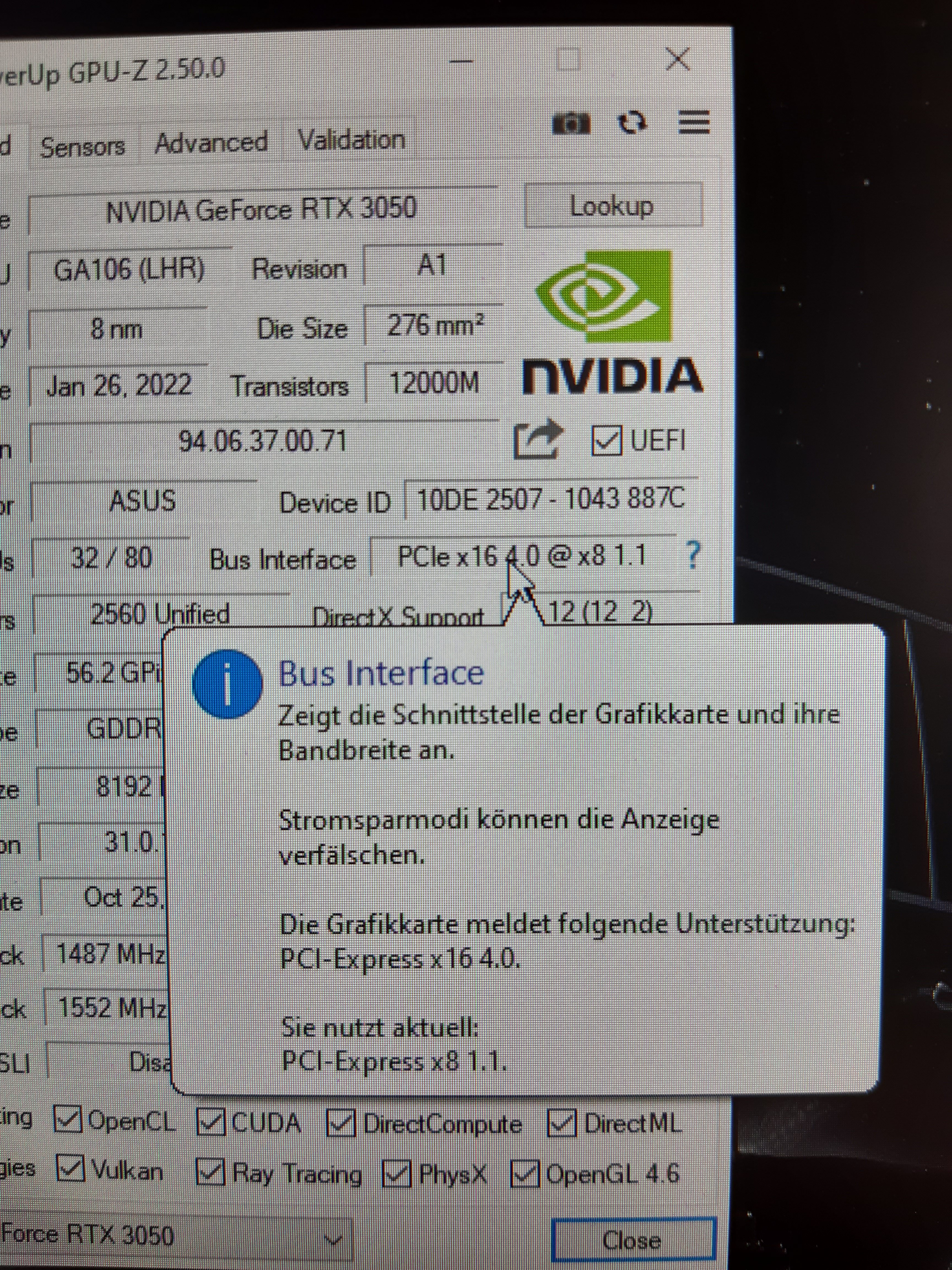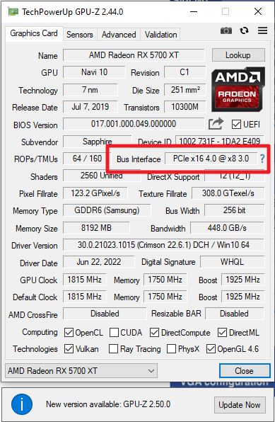Der folgende CPU-Z Screenshot zeigt beim Bus Interface "PCIe x16 4.0 @x8 3.0".