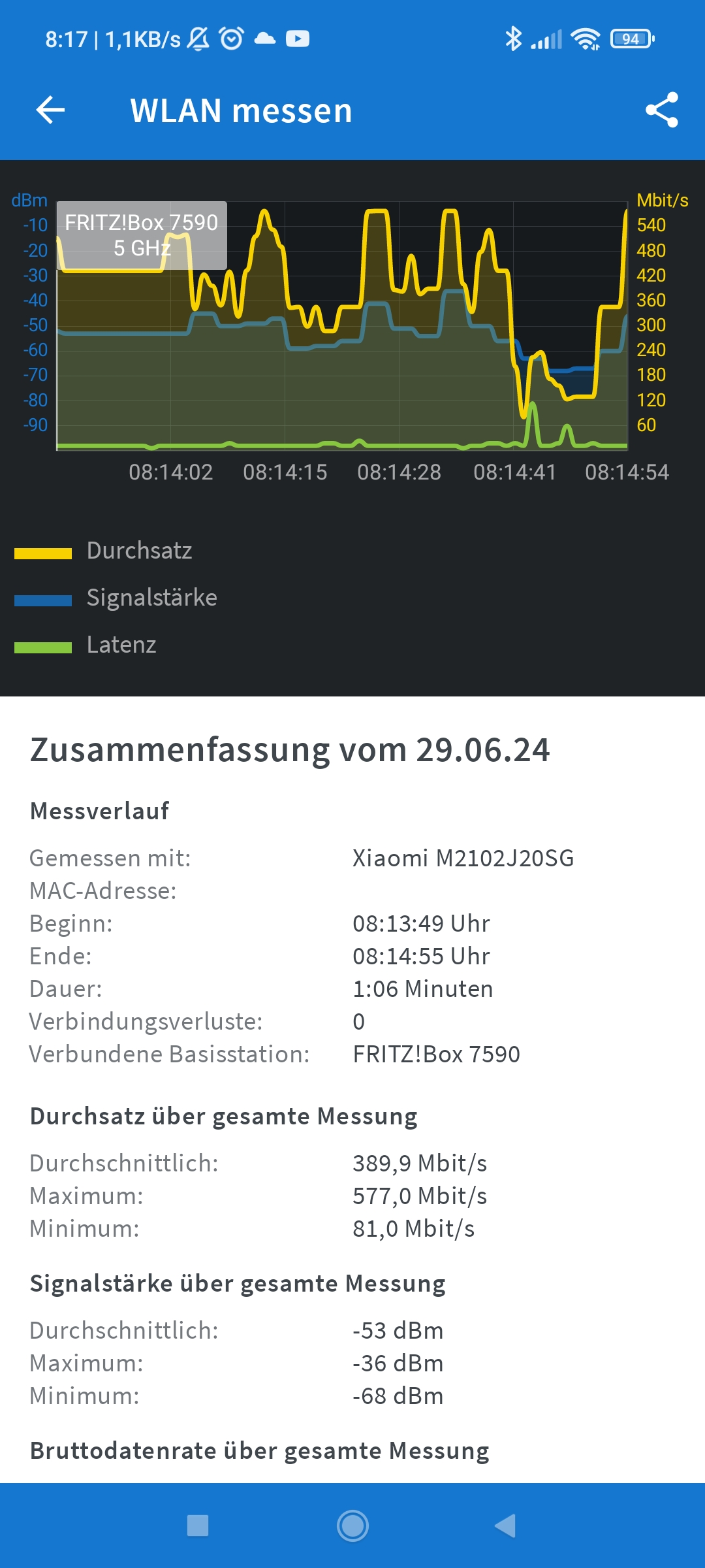 Hier mal eine kleine WLAN-Ausleuchtung aus meinem Erdgeschoss mit der 7590 und einem über drei Jahre alten Poco X3 Pro: