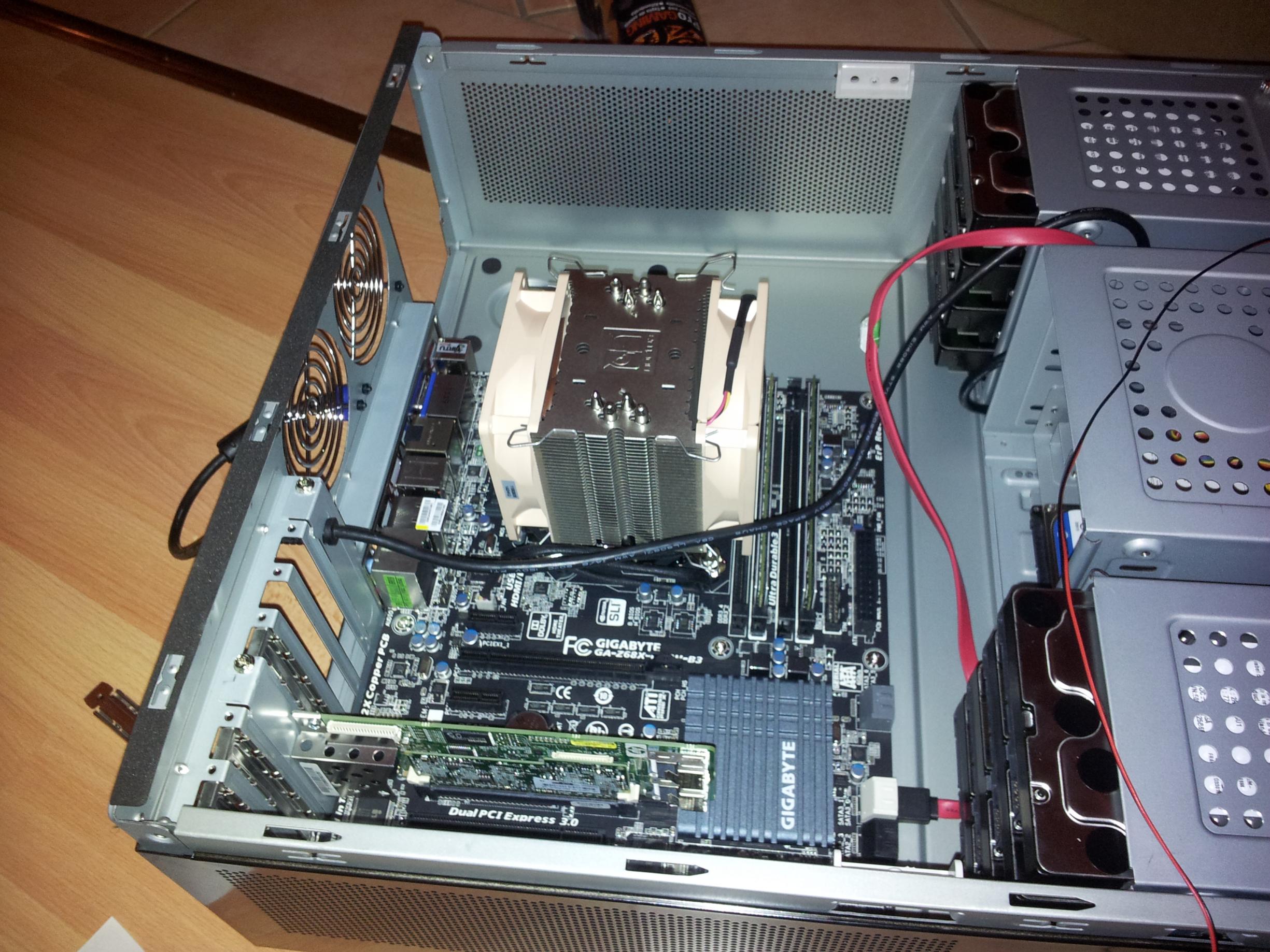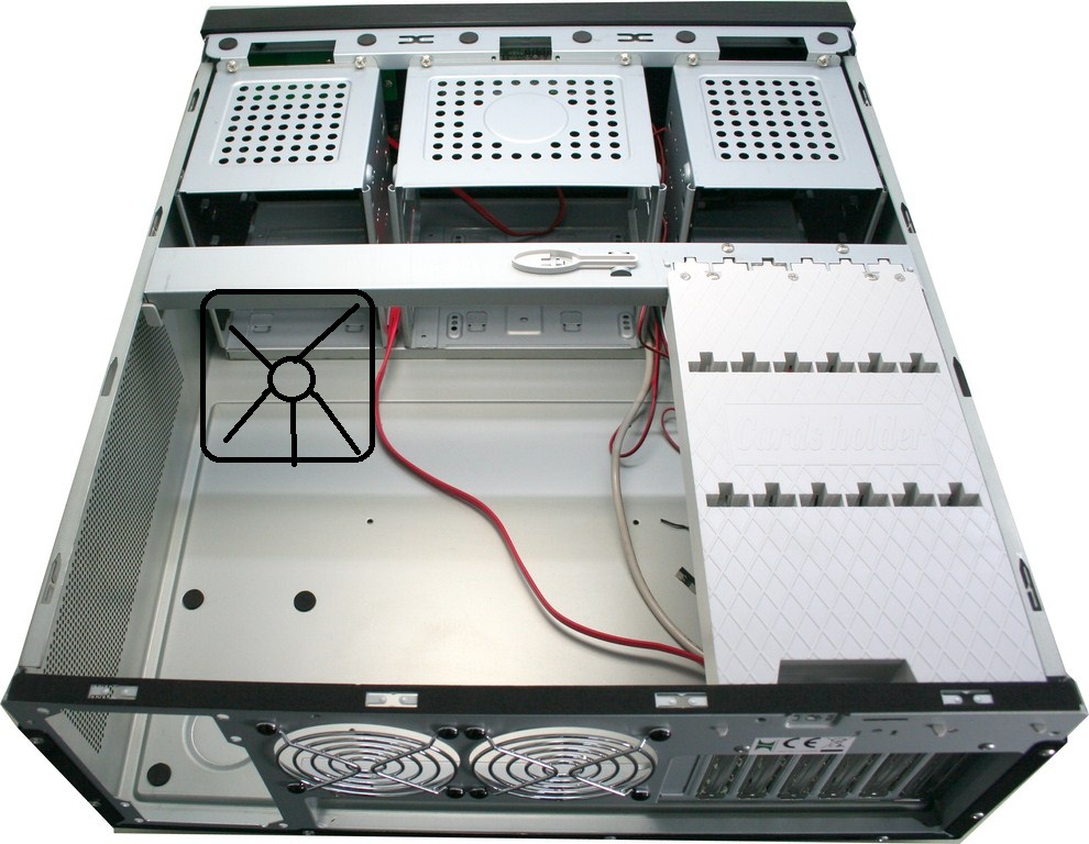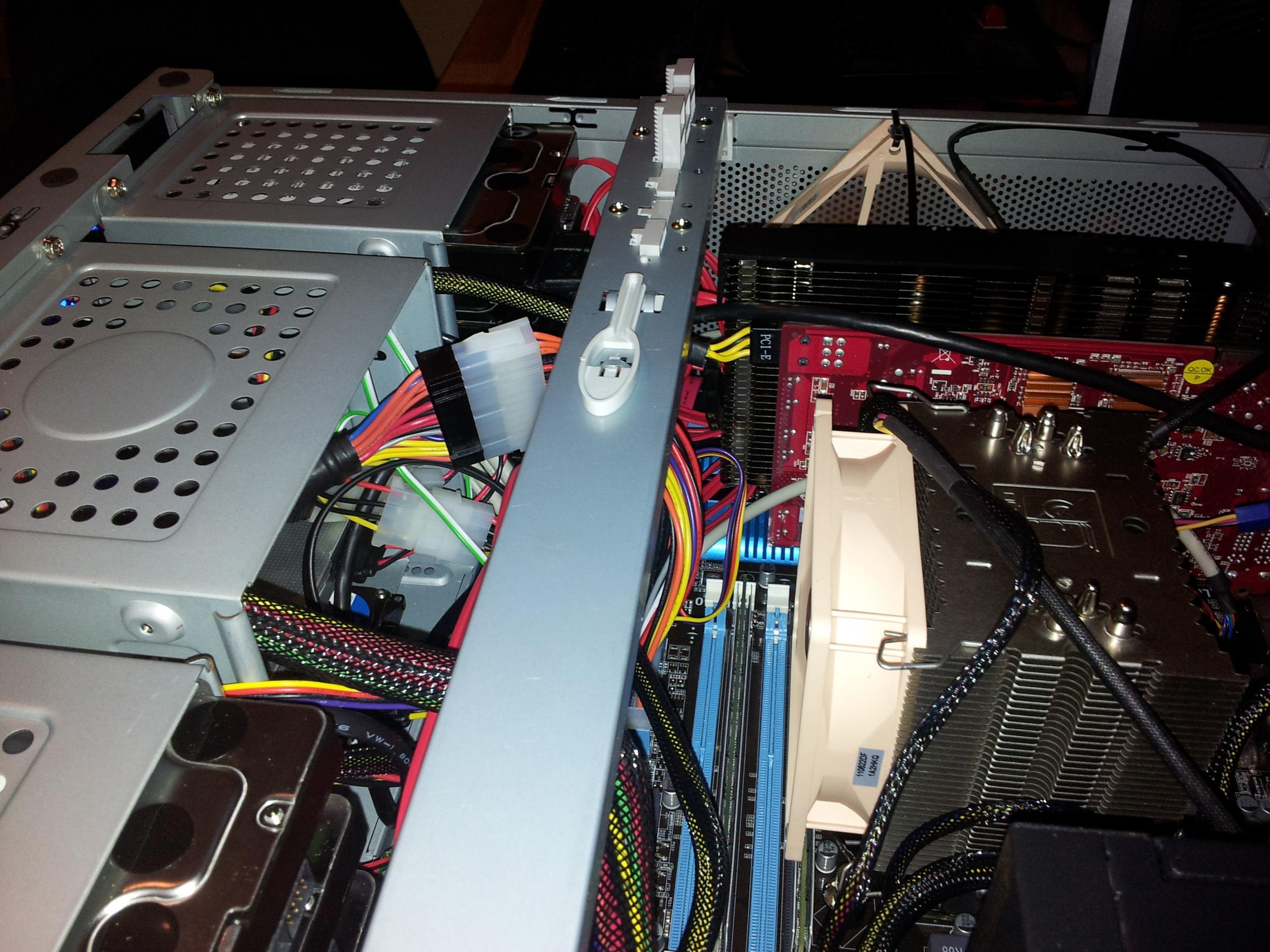 Da vor den Festplatten kein Platz für einen Lüfter ist bleibt mir nur die Möglichkeit die Lüfter mit Kabelbindern an der Mittelstrebe (sie Bild) anzubringen um die Festplatten zu kühlen.