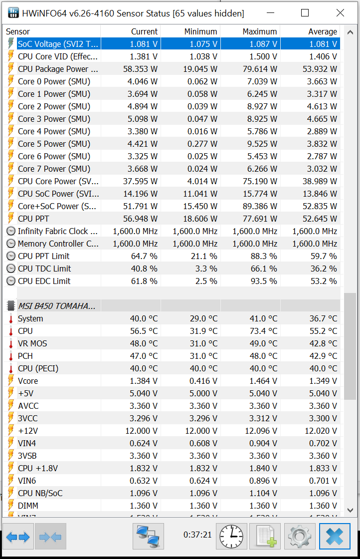 Ich habe A-XMP jetzt mal wieder aktiviert und HWiNFO64 laufen lassen. Wie man auf dem Screenshot sieht ist die SoC Voltage fast immer bei 1.081V. In den Logs (und auch auf dem Screenshot) sieht man allerdings, dass die Voltage immer mal wieder für einen Abtastpunkt auf 1.075V fällt.