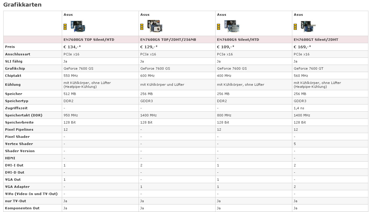 Ich habe mal einen Screen vom GraKa Vergleich gemacht! Bisher dachte ich an die 7600GT. Wenn ich allerdings den Vergleich sehe, scheint die EN7600GS TOP/2DHT/256MB ja nicht wirklich schlechter zu sein!