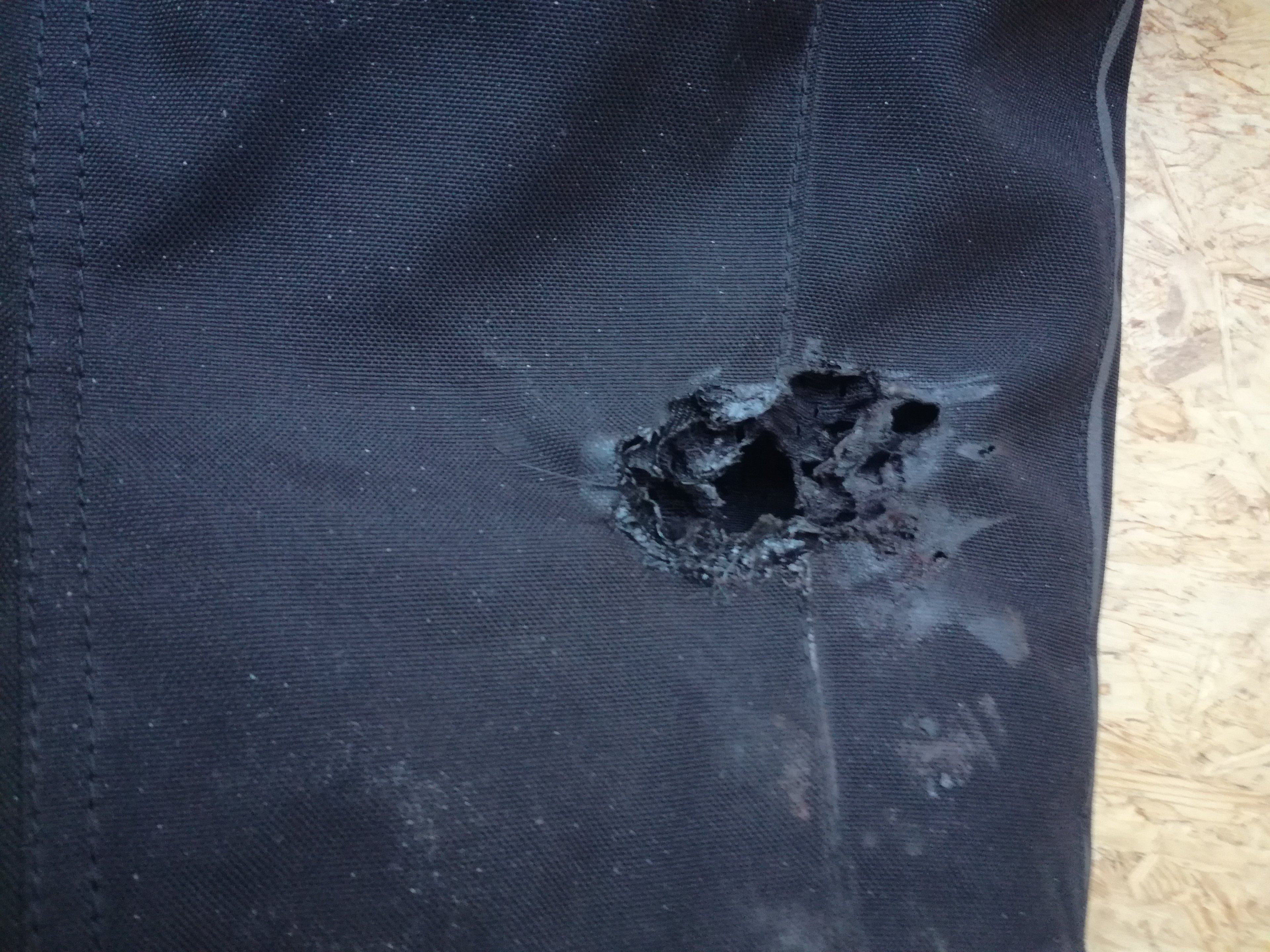 Leider hat mir dann doch noch was den Tag vermiest: Auf dem Weg zur Hausstrecke bin ich mal die WR eines Kumpels gefahren, dessen Krümmer im Nachhinein bemerkt eher mangelhaft isoliert war. Das Resultat der Sache war, dass mir im nächsten Dorf irgendwann ziemlich heiß wurde und dieses unschöne Brandloch entstand: