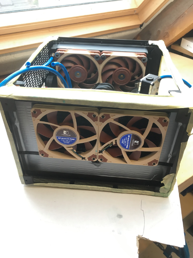 Was man auf dem Bild nicht sieht: Das Lüftungsgitter des Gehäuses zwischen unterem Radi und den absaugenden Lüftern wurde per Dremel komplett entfernt. Hauptsächlich, damit die absaugenden Lüfter keine Hindernisse im Ansaugbereich haben - sonst werden diese schnell laut. Der Abstand zwischen den Lüfterblättern und dem Radiator beträgt ca. 8 mm - das reicht zur Lärmvermeidung...
