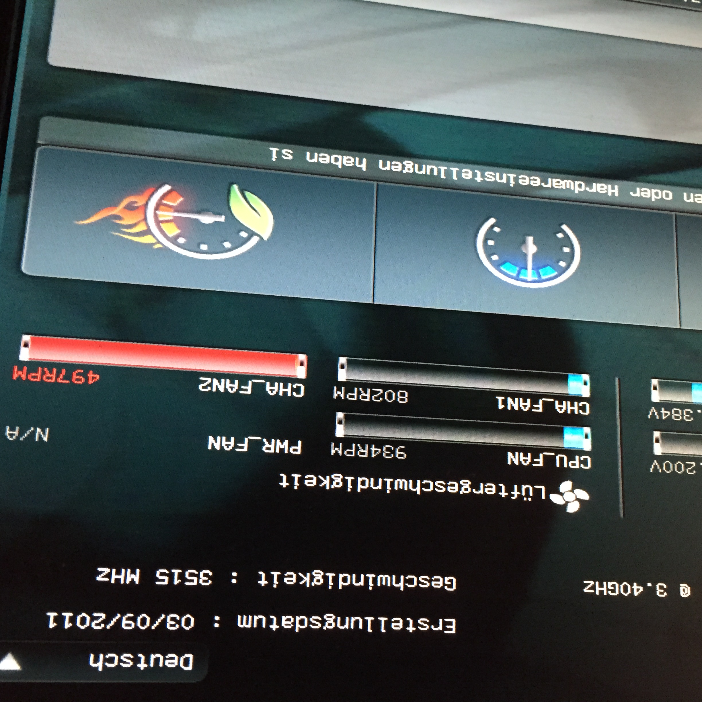 ich hätte da mal ne Frage. Undzwar hab ich mir eben einen neuen Kühler für meinen Prozessor zu gelegt, da der bei meinem alten Kühler immer ne Fehlermeldung anzeigte, es sei zu heiß und es waren immer kontinuierlich 87 Grad. Da hab ich mich beraten lassen und es hieß neuer Kühler. So den hab ich mir geholt und eingebaut es läuft auch alles, aber im Bios auf der Rechten Seite (Siehe AB) steht Lüftergeschwindigkeit und was mir sorgen macht ist bei CHA_FAN2, da steht 497RPM und ist im Roten Balken.