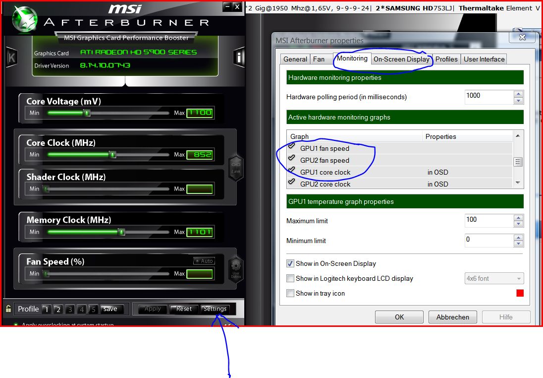 Habe es eingestellt er soll mit dem OSD Die Temps beider GPUs und die Geschwindigkeit der Lüfter anzeigen, habe jetzt das MSI on Screen Display Server habe Start with Windows und Show on Statistics eingestellt, zuvor aber im Afterburner eingestellt mit was für Tasten er das Display starten soll war gerade im Game doch leider tat sich da nichts als ich die Tase gedrückt habe.